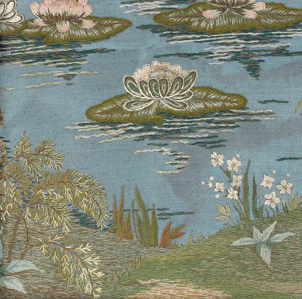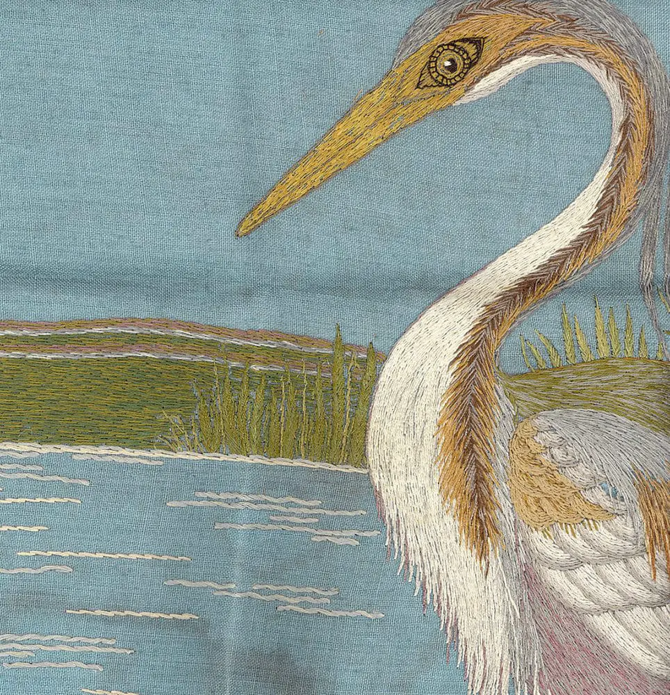 This piece features vibrant silk embroidery on a light sky blue cotton backdrop. Most of the embroidery is done in straight stitching, except for the bull-rushes, which have a unique raised dimensional style. While it's in very good condition overall, there are light stains scattered across many parts. The edges, once folded and framed, show slight tattering. Its size measures 23 inches (58 cm) by 33 inches (84 cm).