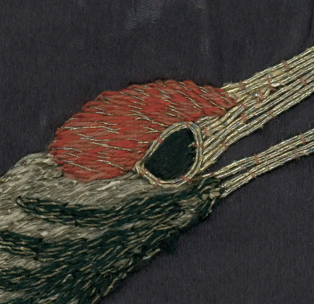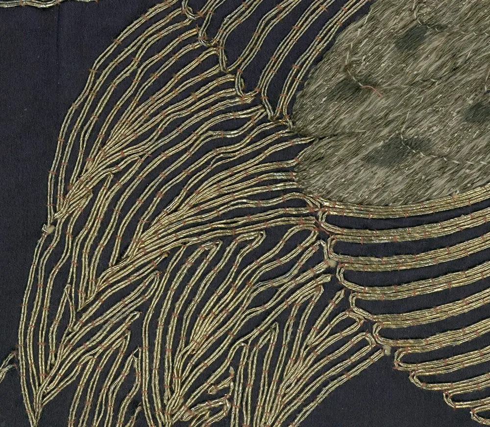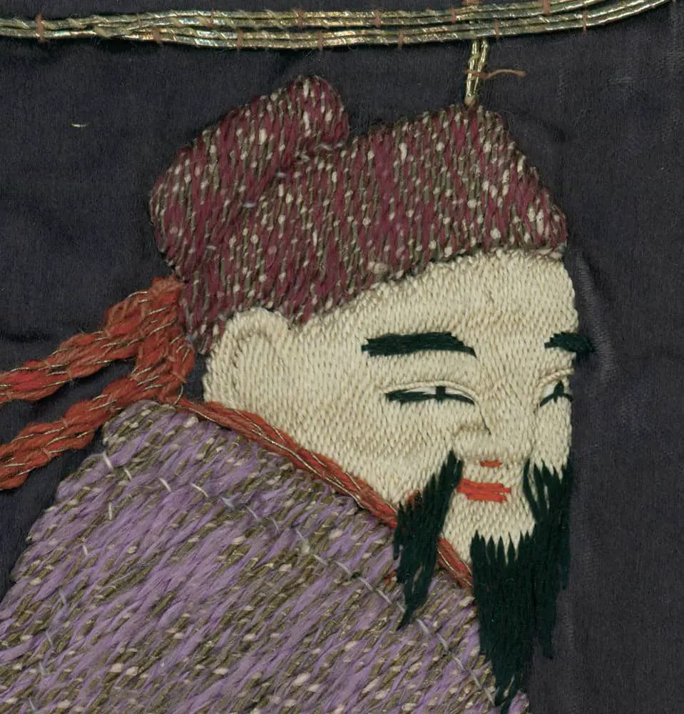 This silk gift cloth showcases a captivating and dreamlike image of a Taoist immortal riding on a flying crane. The silk background is crafted from luxurious shusu silk and features abundant fine embroidery and metallic couching. In good condition, it exhibits numerous tiny age-related tears in the silk background, measuring 26 inches by 28 inches (66 cm by 71 cm).
