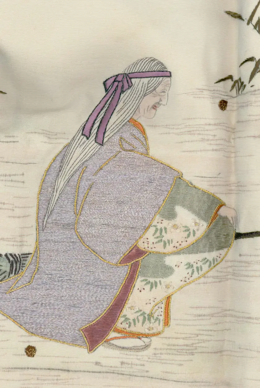 This large embroidered fukusa, measuring 26 inches by 28 inches (66 cm x 71 cm), is in very good condition, except for a missing corner tassel. It portrays the Takasago Legend, one of the oldest in Japanese mythology.