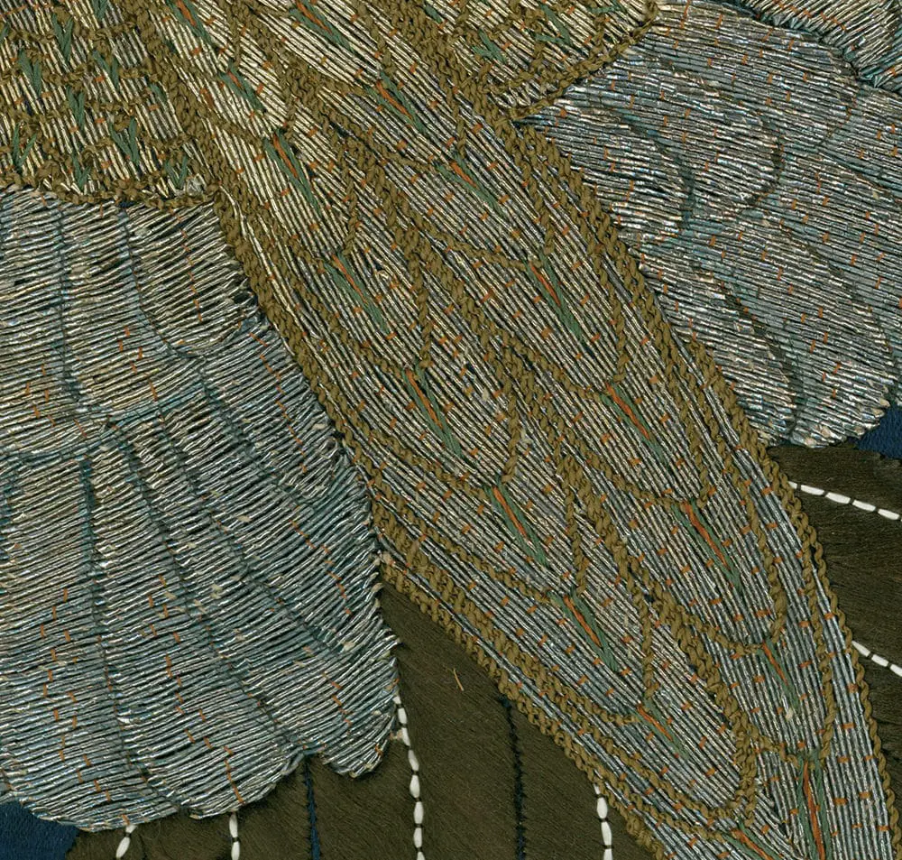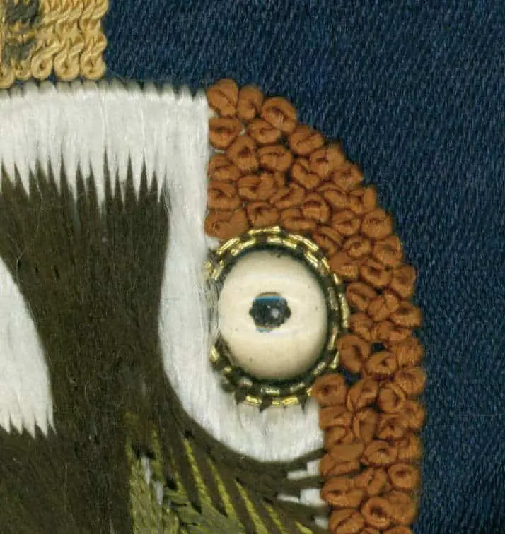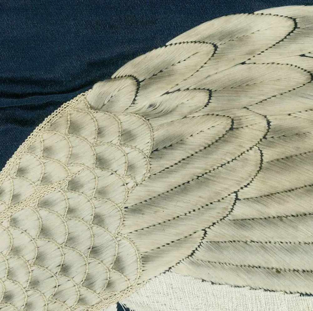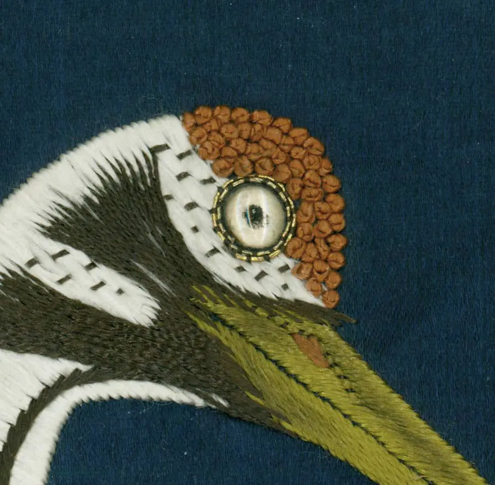 This silk gift cover cloth showcases three embroidered cranes, representing good fortune and long life in Japanese symbolism. Measuring 28 inches by 29 inches (71 cm x 74 cm), it remains in good condition, albeit with abrasion in the center-right area. This abrasion has resulted in some missing embroidery around the feathers of one crane and the feet of another.