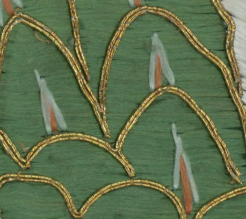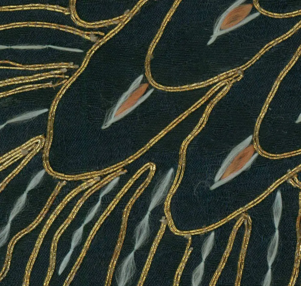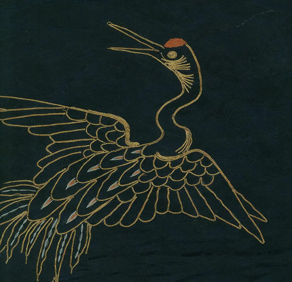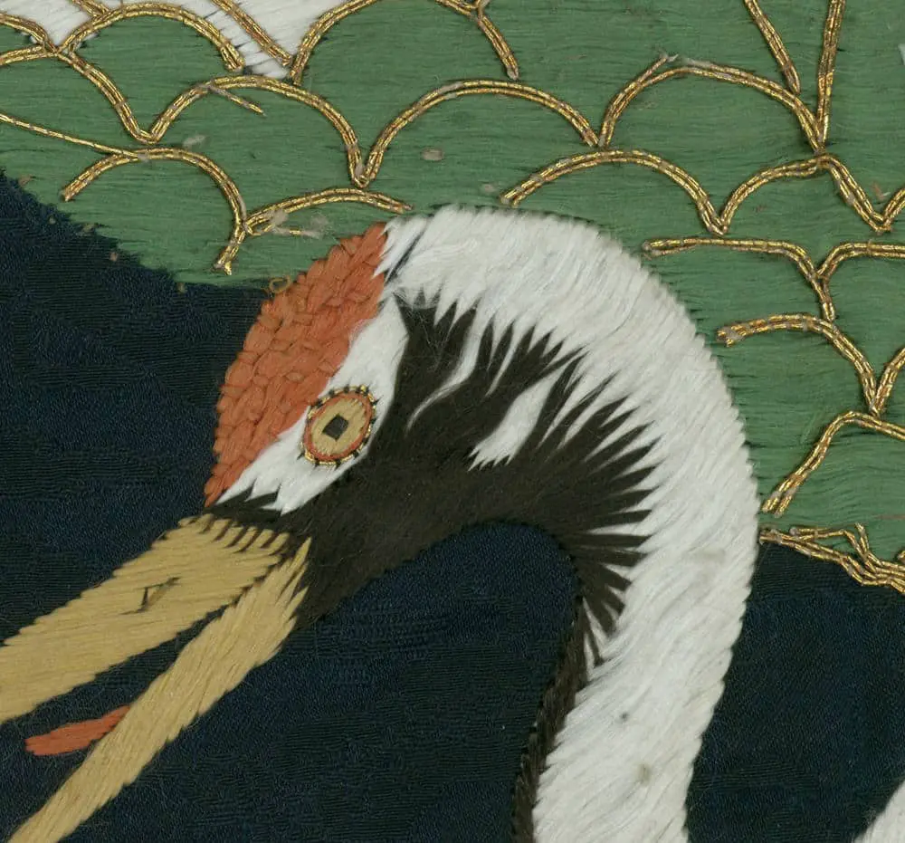 This silk gift cover showcases three embroidered cranes, symbolizing good fortune and longevity in Japanese culture. Measuring 25 inches by 25 inches (64 cm x 64 cm), it exhibits wear along the back and edge border, with a few areas where the embroidery has loosened.