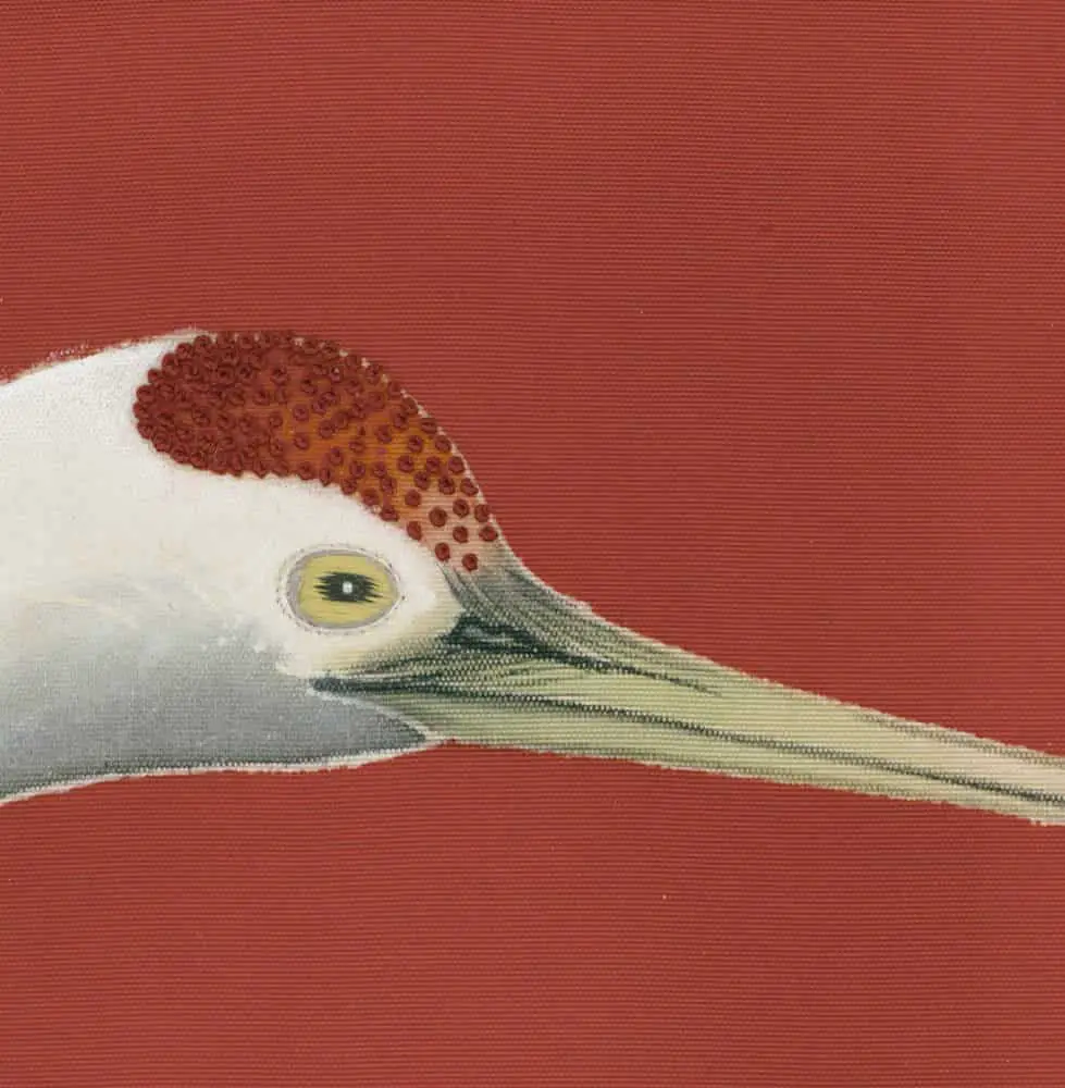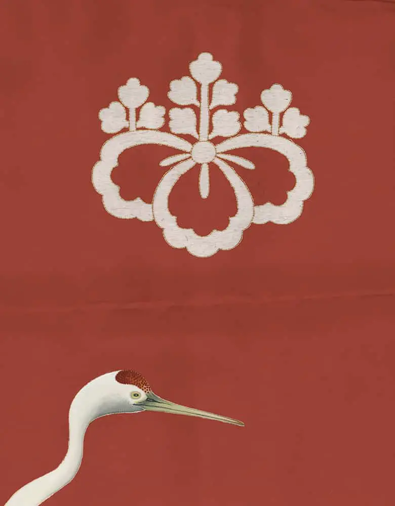 This silk 'kyodai' (mirror) cover showcases a finely yuzen-dyed crane with embroidery highlights and a large fully-embroidered family crest. Measuring 17 inches (43 cm) in width and 37 inches (94 cm) in height, it generally remains in very good condition, despite the presence of two small red stains on the silk border.