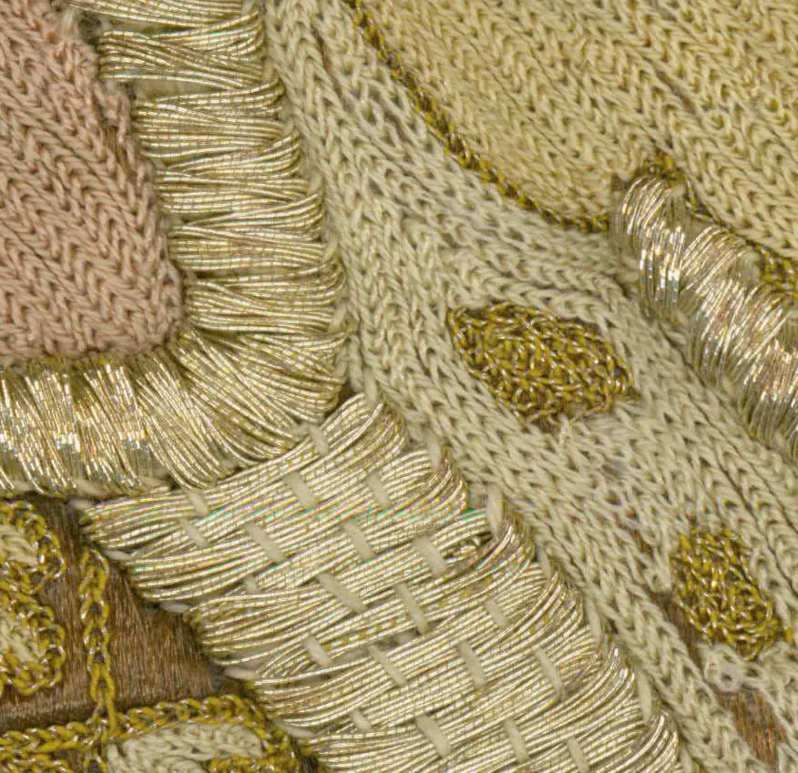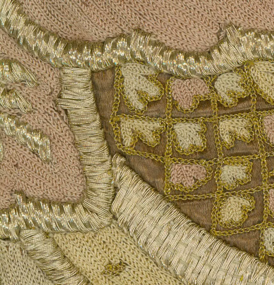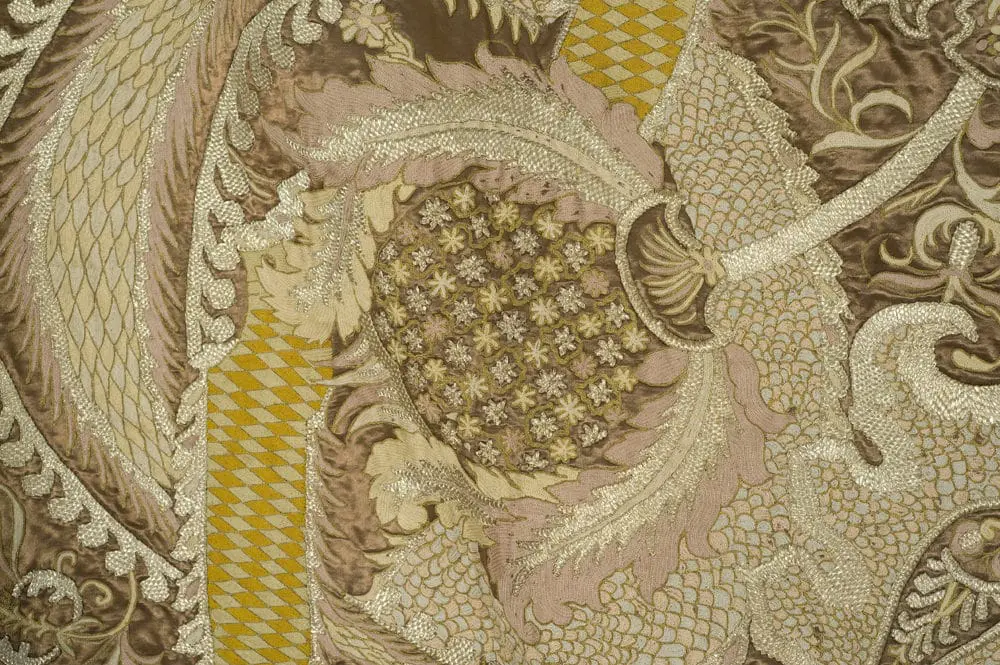 This unique embroidered hanging crafted from brown satin showcases tamboured silks and lavish couched metal thread. The intricate work features exceptionally fine chain-stitch embroidery, forming large exotic blooms and scale-patterned serpentine vines. While in very good condition, there's slight overall wear leading to numerous tiny "bald spots" within the embroidery layer, visible only upon close inspection. Its dimensions are 96 inches by 68 inches (244 cm x 173 cm).