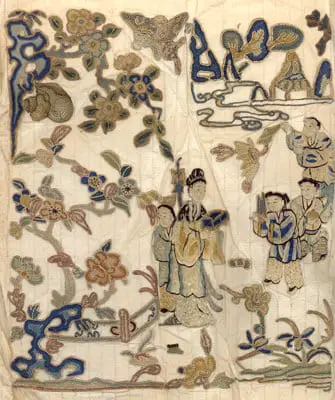 This embroidery consists of delicately crafted appliques using seed stitch ("forbidden stitch"), silk floss, and couching techniques. Each applique is gently affixed to a single sheet of fragile, soft-textured hand-made rice paper. Measuring 18 inches (46 cm) in width and 10 inches (25 cm) in height, this piece may have been part of a cherished heritage book, evident from its folded center.
