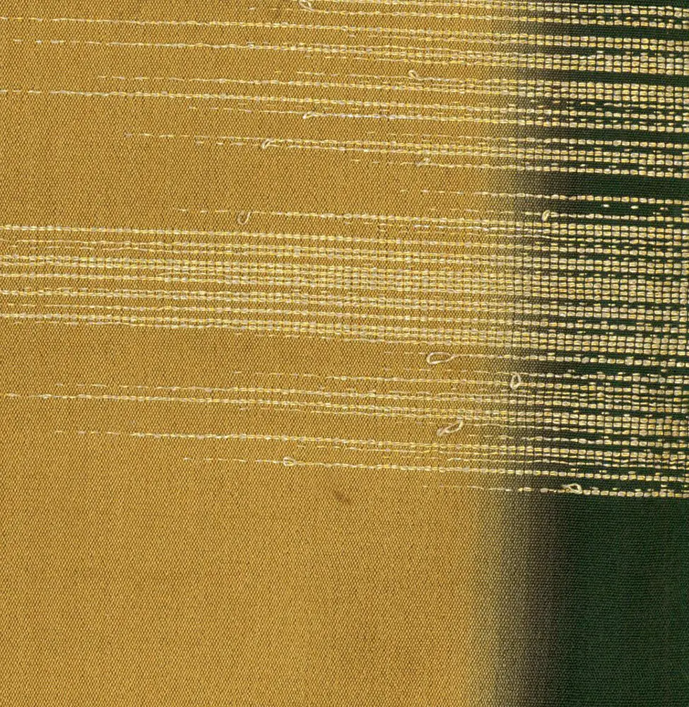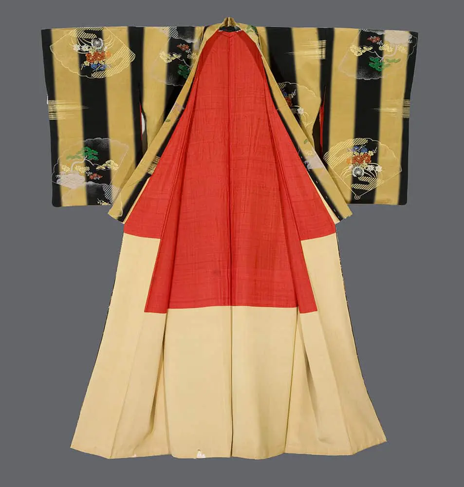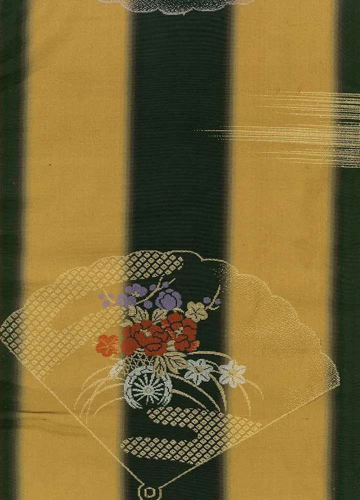 This kimono represents a fascinating synthesis of traditional Japanese symbolism with the period's embrace of geometric modernism. The bold vertical stripes reflect Western influence and Art Deco sensibilities, while the supplementary woven fan motifs maintain connection to classical Japanese textile traditions. The result is a garment that captures the dynamic cultural exchange of the interwar period, when Japanese designers were creating innovative interpretations of their heritage within contemporary aesthetic frameworks.