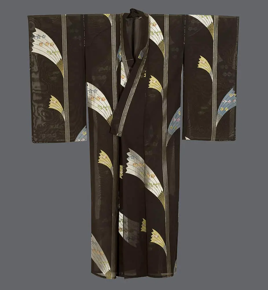 This sophisticated summer kimono presents paper fan (sensu) motifs, rendered in alternating white, pale blue, and golden yellow against the rich charcoal ground, demonstrate a distinctly modern approach to pattern-making that echoes the streamlined aesthetic principles of Art Deco while maintaining the seasonal appropriateness central to Japanese textile tradition. The fans appear to float in dynamic diagonal arrangements that create visual movement across the garment's surface, suggesting the cooling breeze that these implements would provide during Japan's humid summers.