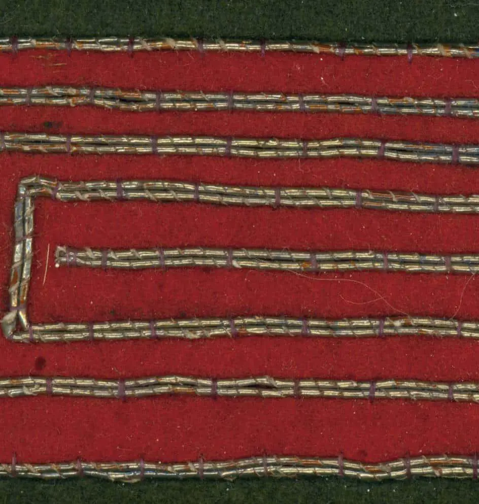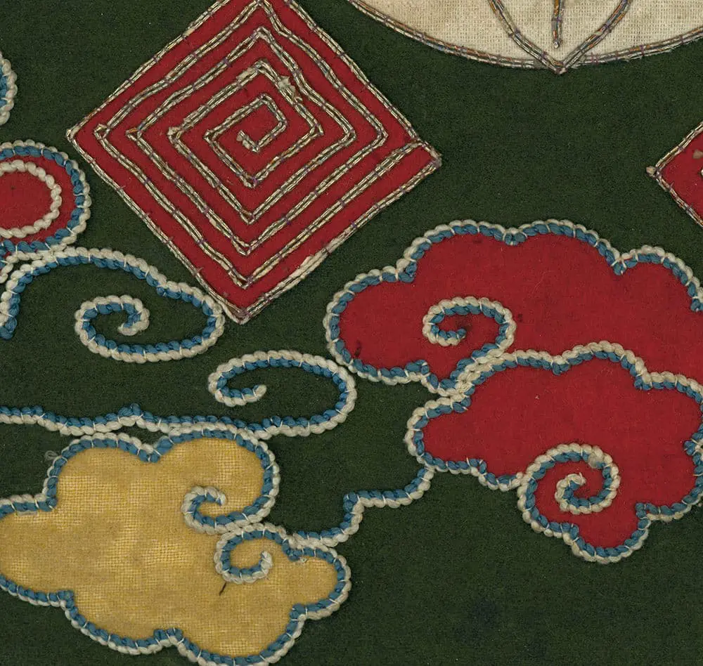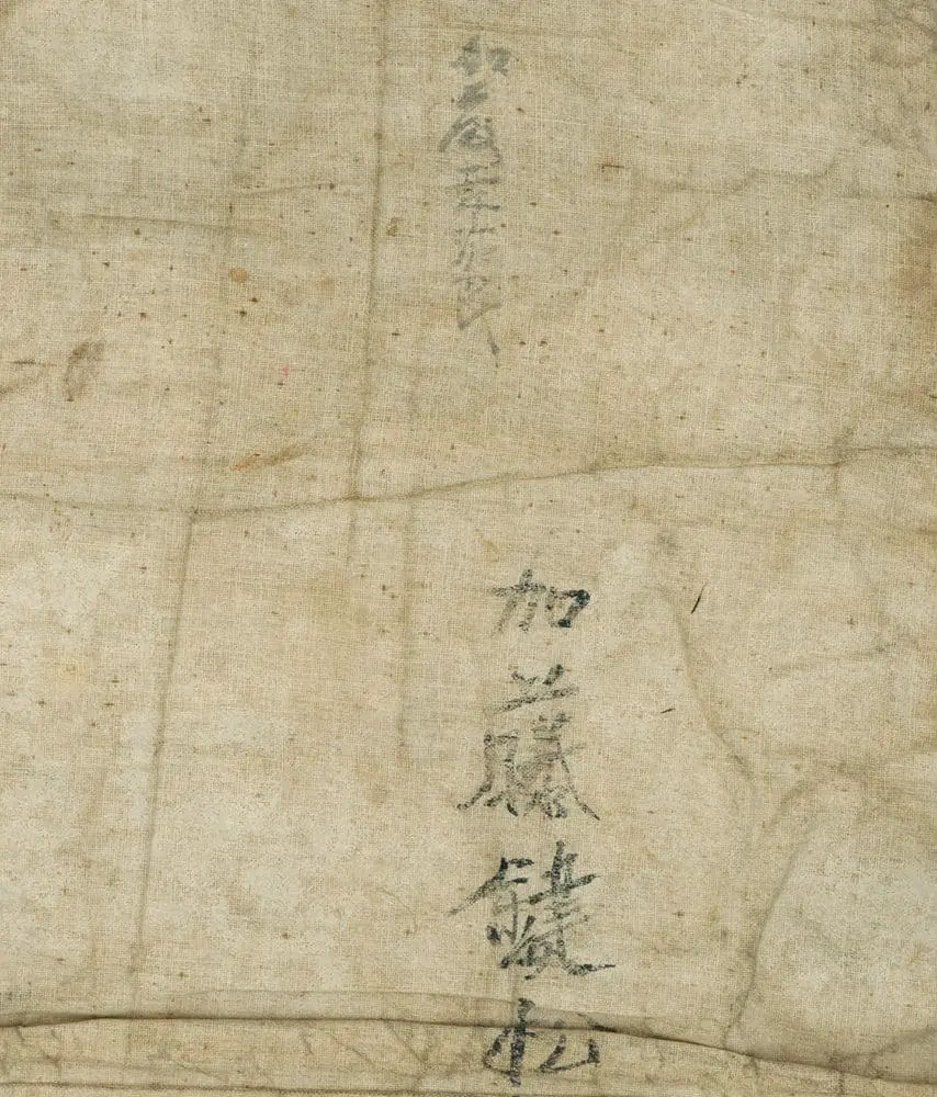 This wool fireman's muneate, a specialized chest protector, is lined with cotton and features a prominent white wisteria family crest (mon). Despite its age, it's in relatively good condition with several small holes and stains. Its dimensions are 10 inches by 21 inches (25 cm by 53 cm).