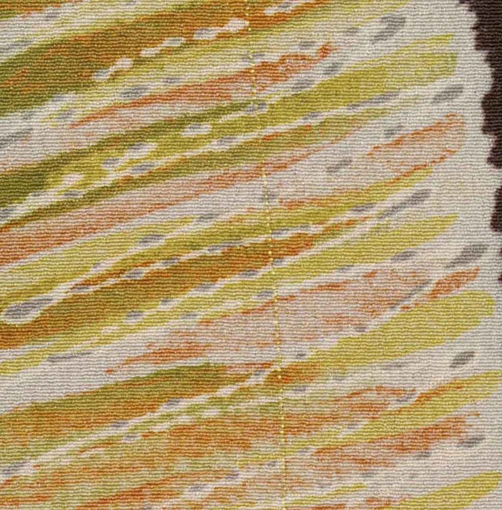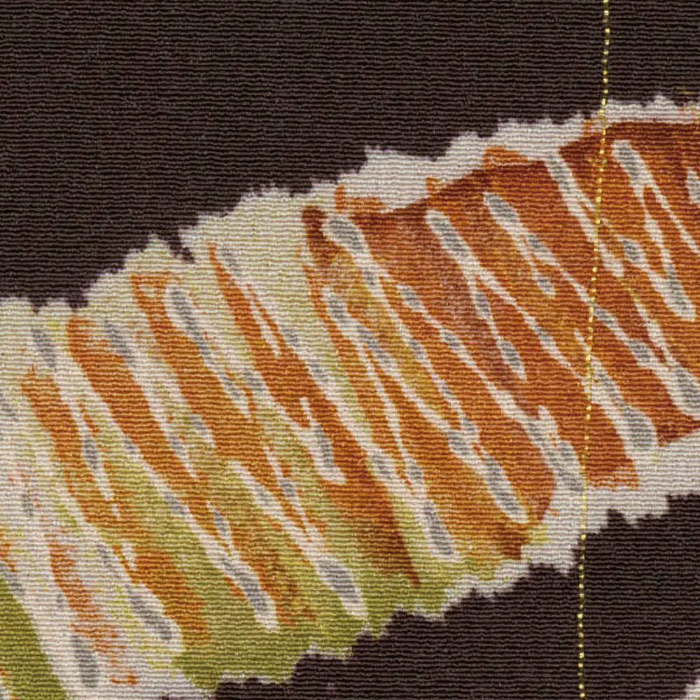This striking chirimen silk kimono exemplifies the era's bold embrace of geometric abstraction and modernized production techniques that transformed traditional Japanese textile arts. The garment features an all-over pattern of radiating star-like motifs rendered in warm earth tones - coral, amber, sage green, and cream - against a deep brown ground, created through precise silkscreen printing that allows for the crisp definition of each eight-pointed star formation. The occasional insertion of vertical gold threads adds luxurious dimensionality and catches light as the crepe silk's characteristic textured surface moves, creating subtle shifts in luminosity across the geometric field.