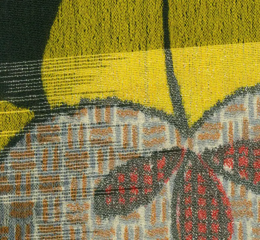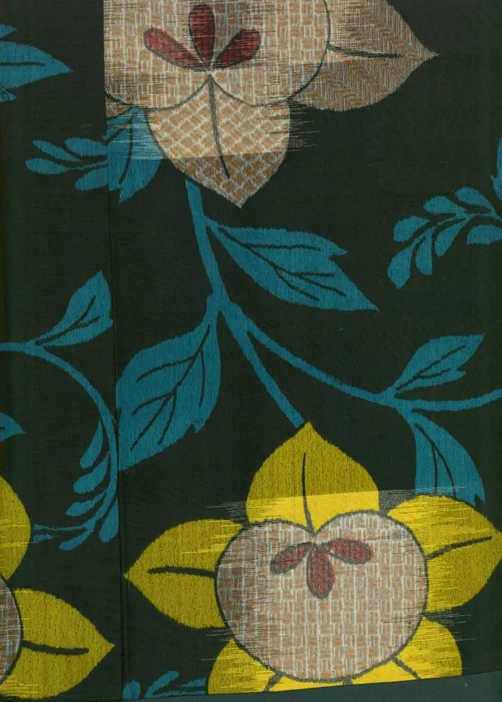 The artistic style and production technique are characteristic of meisen textiles. The design itself, with its large-scale, graphic flowers and scrolling vines set against a dark background, is indicative of the period's artistic trends. The vibrant color palette—featuring bright yellows, teals, and touches of red—was made possible by the use of synthetic dyes, which allowed for a much broader and more brilliant range of colors than traditional plant-based dyes. The overall effect is a dynamic fusion of a traditional Japanese symbol with a distinctly modern, almost Western Art Deco-influenced graphic style, perfectly capturing the spirit of a Japan that was embracing modernity while still holding onto its rich cultural heritage.