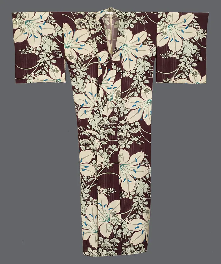 Symbolically, the lily motifs carry associations with purity, renewal, and feminine grace, making this kimono particularly appropriate for summer festivals and elegant social occasions. The abundance of floral imagery suggests prosperity and natural beauty, while the sophisticated color palette speaks to refined taste and social status. This garment represents the height of Japanese summer textile artistry, where technical mastery in both weaving and dyeing creates clothing that is simultaneously practical and profoundly beautiful, embodying the Japanese aesthetic principle of finding extraordinary beauty in everyday objects designed for specific seasonal purposes.