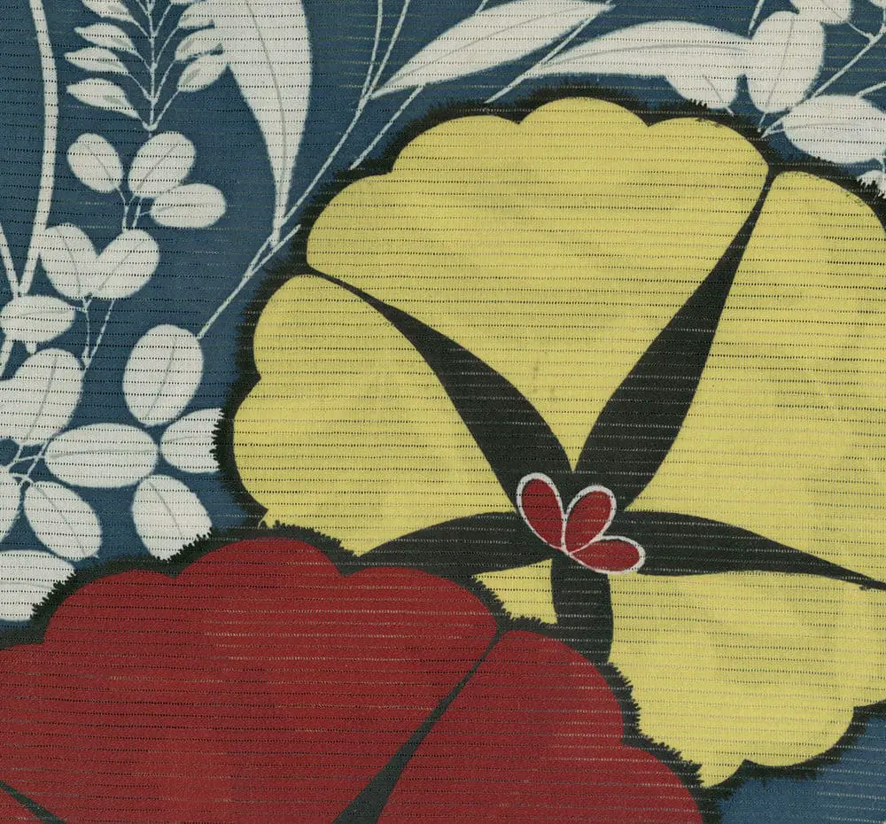 The design philosophy reflects the influence of the Mingei folk craft movement and early modernist principles, with its bold geometric interpretation of traditional forms and confident use of contrasting colors. The close-up views reveal the characteristic open weave of ro gauze, designed to provide cooling airflow during Japan's humid summers. The horizontal ridges visible in the textile structure show the meticulous craftsmanship required to maintain pattern registration across such an open weave, demonstrating the technical mastery of early 20th century Japanese textile artisans during a period of rapid cultural modernization.