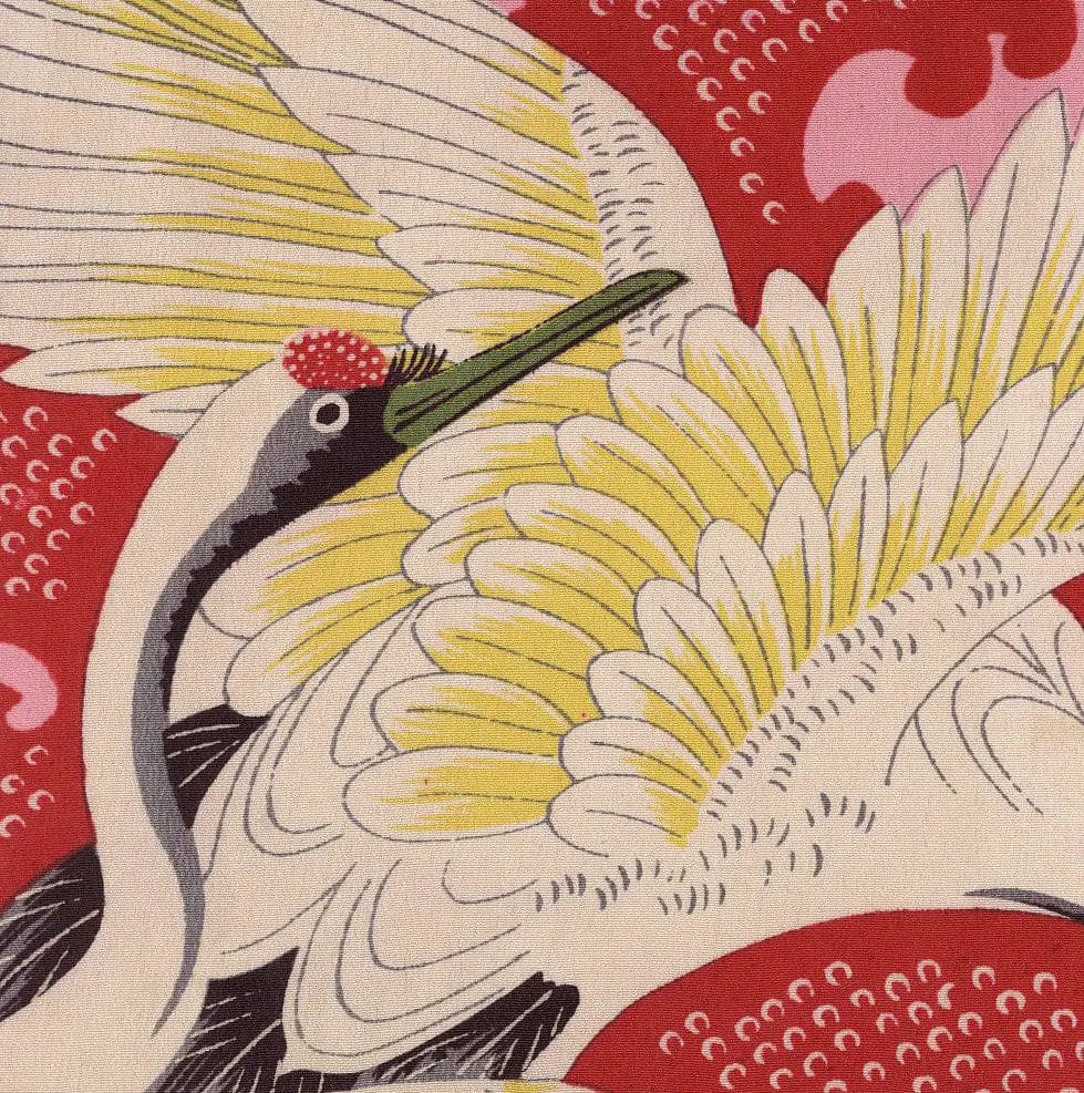 This chirimen silk juban possesses a soft pink ground, providing a delicate backdrop for the dynamic composition of soaring cranes rendered in cream and gold with distinctive black wing tips, their forms created through the relatively new silkscreening process that allowed for more affordable yet sophisticated textile production during this era. The stylized waves, depicted in bold red with characteristic foam crests, create a rhythmic pattern that suggests both the rolling motion of the sea and the decorative seigaiha (blue ocean waves) motif that has adorned Japanese art for centuries.