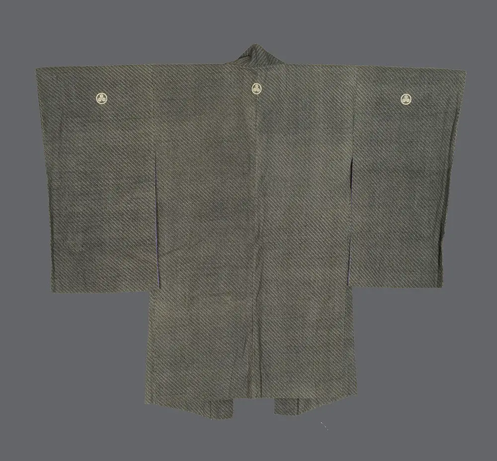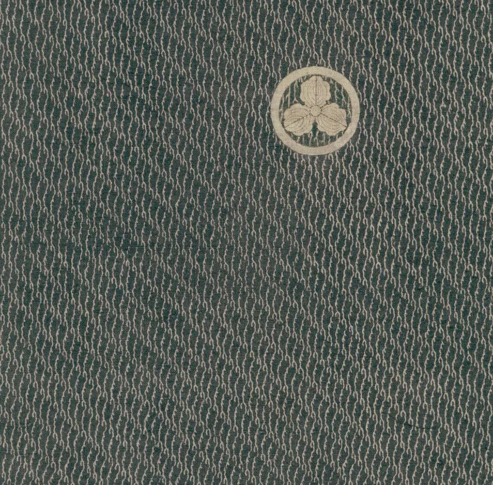 This formal cotton haori, features three mon on the back. Measuring 47 inches from sleeve-end to sleeve-end and standing 38 inches tall (119 cm x 97 cm), it remains in excellent condition.