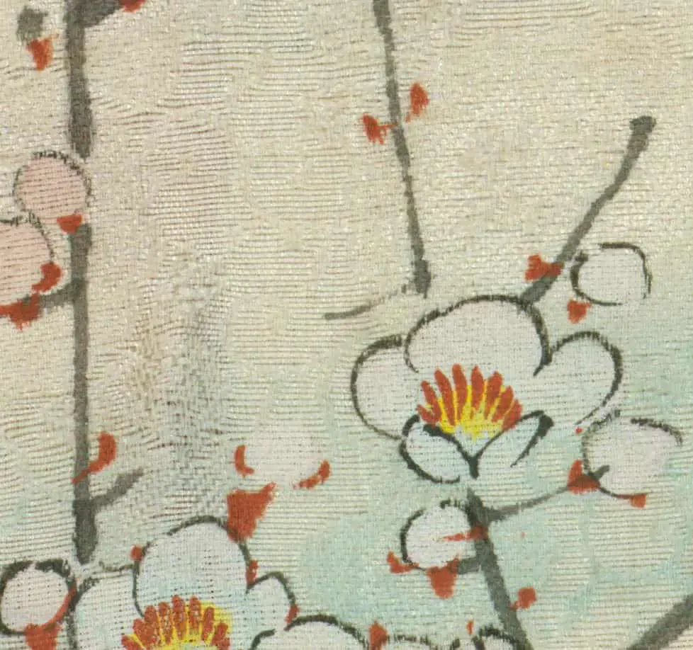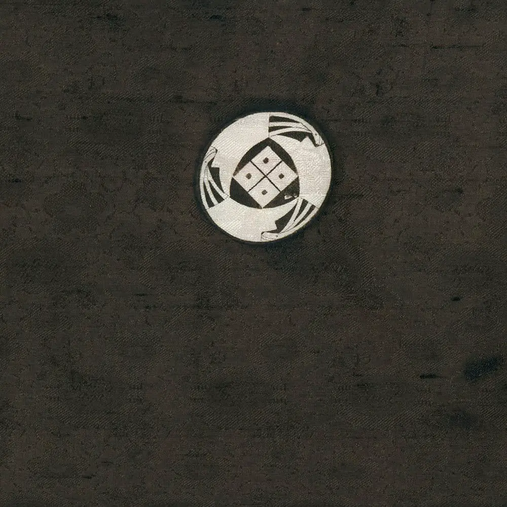 The nature scenes depicted in the pattern-work employ free-hand painting, yuzen-work, gold-thread couching, and simple embroidery, displaying an extraordinarily refined artwork—arguably the most sophisticated and intricate in Japanese garment artistry encountered to date. This robe features five formal family crests, indicating a high social standing for the wearer. Notably, these crests are rare, not listed in publications containing over 2,000 different crests. They comprise a folded fan ('ogi' or 'sensu') motif in the outer circumference and a central square 'mesh' ('meyui').