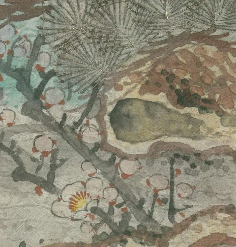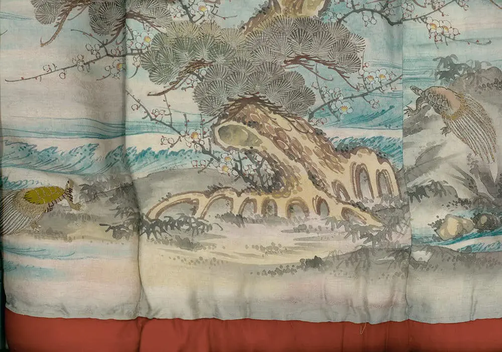 This remarkably elegant silk woman's robe showcases traditional auspicious motifs like pine trees, plum trees, flying cranes, and minogame turtles, all symbolizing longevity and happiness. The fabric base features a complex damask or brocade weave, demonstrated in detail images, with 'bokashi' gradual shade dying complemented by brush strokes—both dry and not-so-dry—as well as embroideries. The inner lining consists of beni red sha silk, with a light padding between it and the outer patterned layer, lending a subtle overall stiffness to the garment. It stands at 50 inches (127 cm) from sleeve-end to sleeve-end and is 59 inches (150 cm) in height, in near mint condition, except for a discreet 2cm silk split within the patterned area.