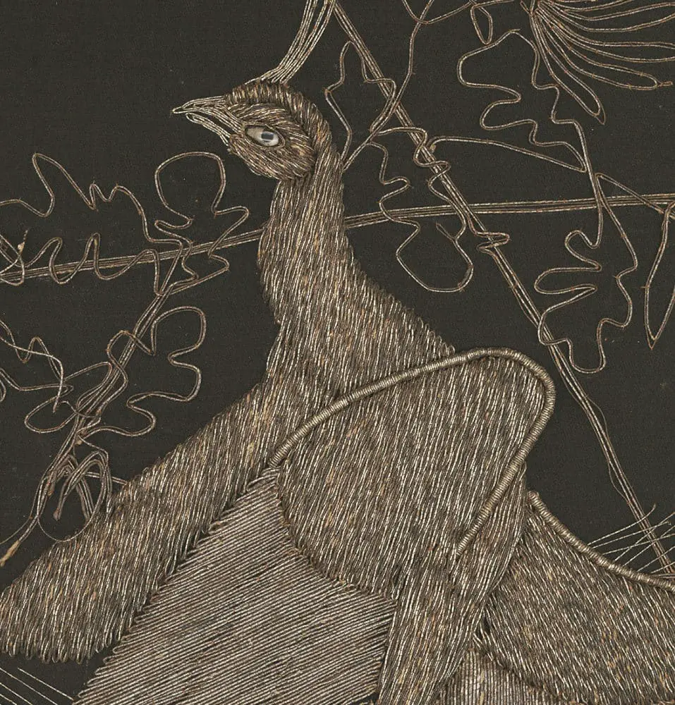 This Japanese export textile presents a metallic thread embroidered hawk capturing its prey, featuring small glass beads for the eyes. In fair condition, it shows signs of wear with many loose threads and a few holes punched through the background. The mounting appears to be original. With the frame, it measures 42 inches by 16 inches (107 cm by 41 cm), and without the frame, it measures 40 inches by 14 inches (102 cm by 36 cm).