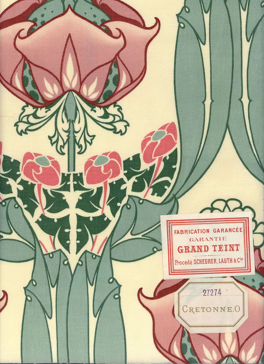 This cretonne (glazed cotton) textile sample, an original roller-printed cotton from France produced in 1906, features exquisite Art Nouveau florals in shades of green and pink against a cream background. It originates from the renowned Scheurer company, prominent European textile printers based in Alsace, France. Retaining its original label specifying the design and fabric content, this fabric sample was purchased at auction in Paris.