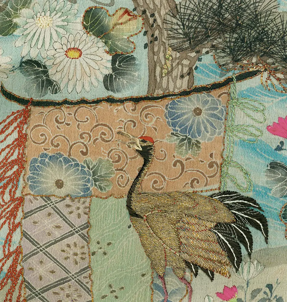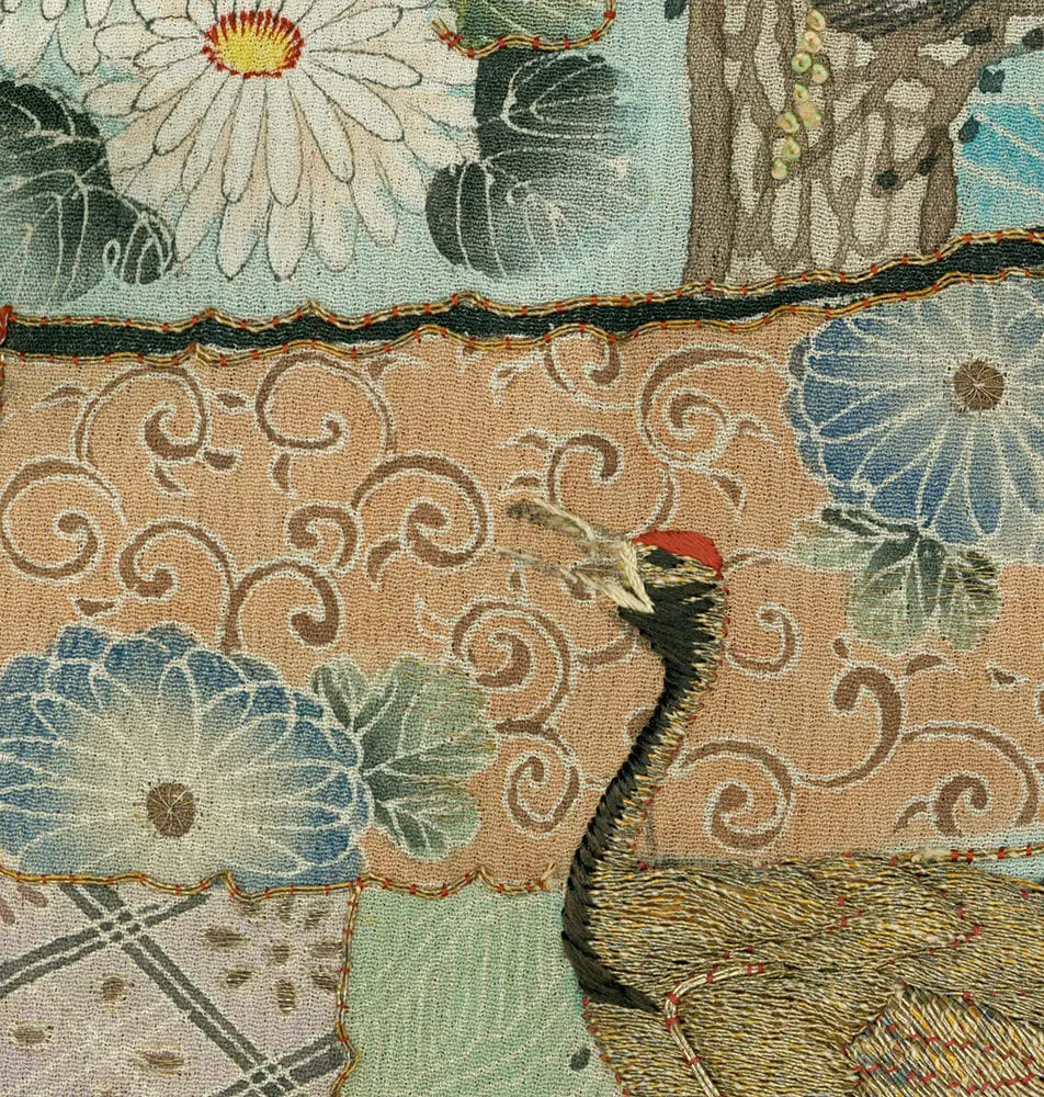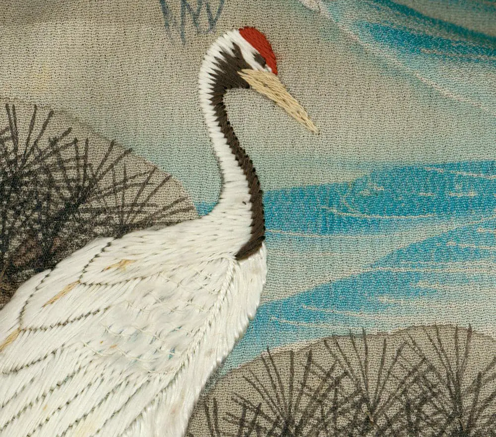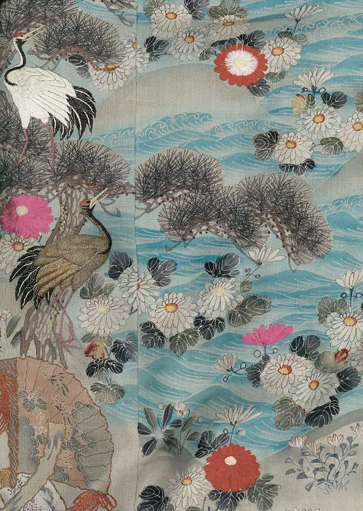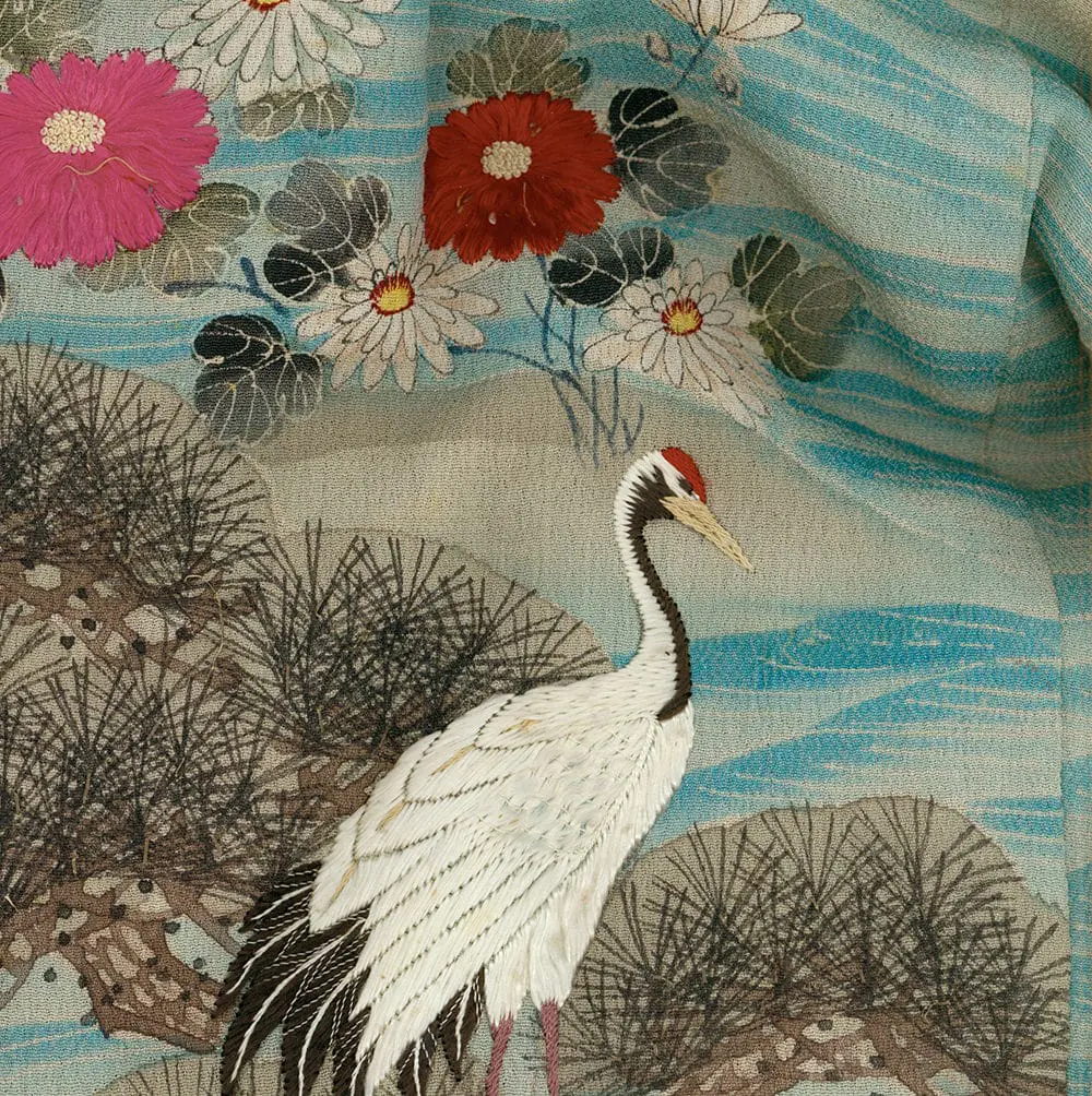 This chirimen silk furisode-style uchikake represents a masterful synthesis of traditional Japanese decorative techniques and auspicious symbolism, executed during the transformative Meiji period. The garment's composition creates a flowing aquatic landscape where stylized blue waves meander across the lower portion of the kimono, providing a dynamic foundation for an array of symbolic motifs. Elegant cranes with pristine white plumage and distinctive black wing markings are positioned prominently throughout the design, their graceful forms rendered with remarkable naturalistic detail through a combination of yuzen painting and delicate embroidery work.