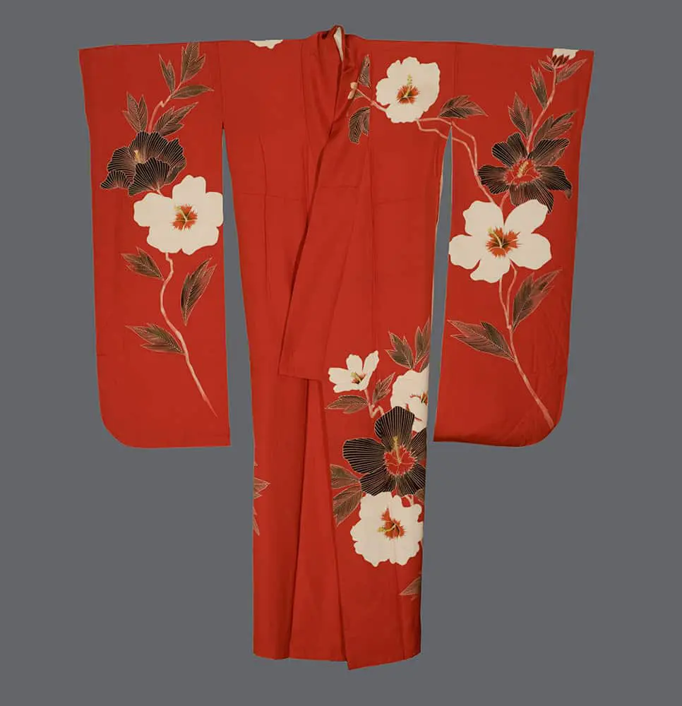 The hibiscus motif carries particular cultural significance, symbolizing gentle femininity, delicate beauty, and the fleeting nature of youth—making it especially appropriate for a furisode, which is traditionally worn by unmarried young women. However, the scale and treatment of these blossoms represents a radical departure from classical Japanese floral representation, where flowers were typically rendered with subtle naturalism and seasonal appropriateness. Here, the hibiscus blooms are monumentalized into bold graphic statements that fill the entire visual field, creating an almost tropical exuberance that reflects the period's more globalized aesthetic vocabulary and the increasing influence of international fashion trends on traditional Japanese dress.