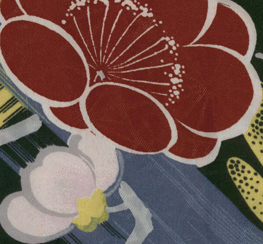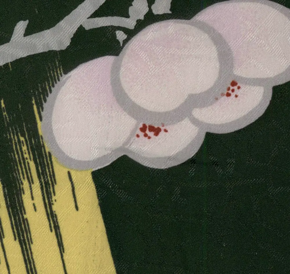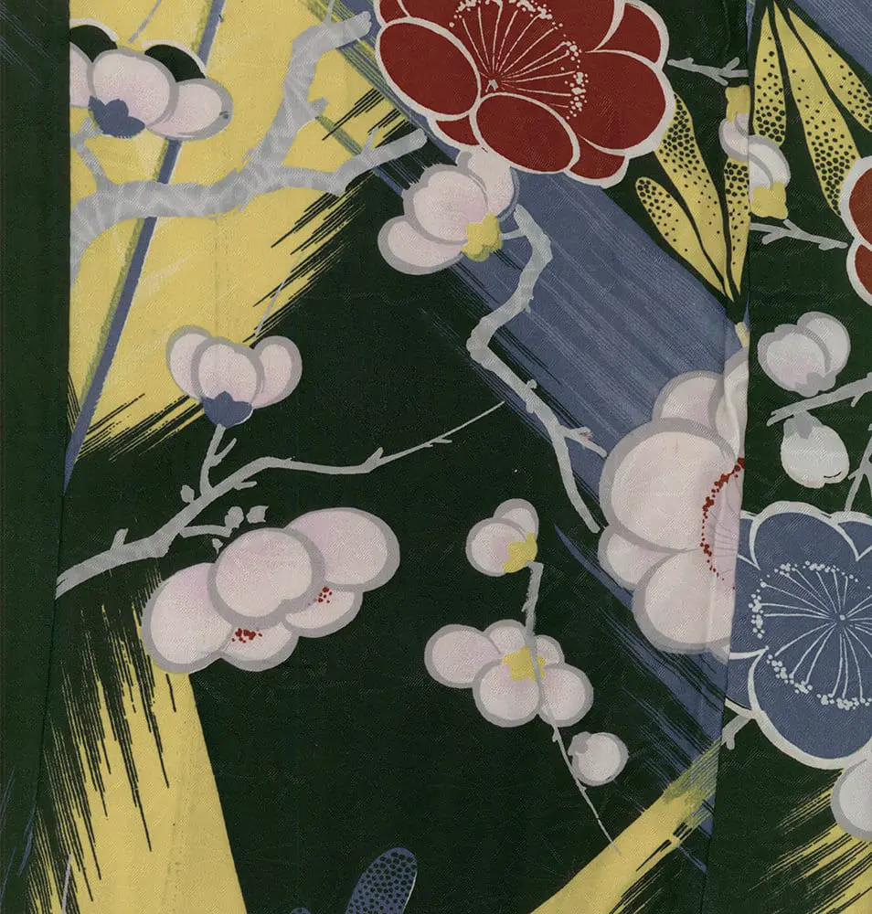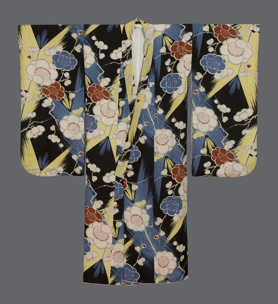 This silk girl's kimono showcases bold yellow, black, and white patterns. It is in good condition, with several small stains, primarily located on the top of the shoulders. The measurements are 43 inches (107 cm) from sleeve-end to sleeve-end and 46 inches (115 cm) in height.
