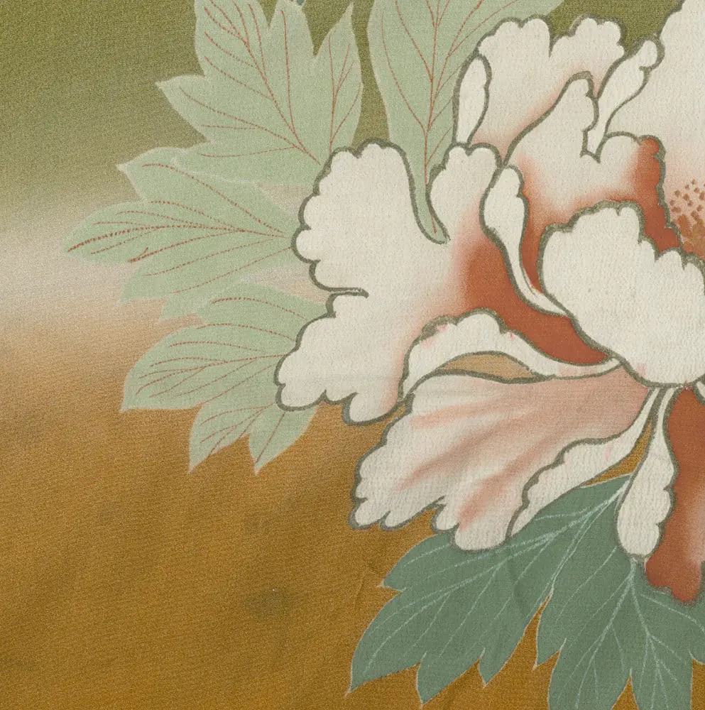 The chrysanthemums appear as stylized circular medallions in the upper portion, executed in coral and cream tones with intricate geometric patterning that reflects both traditional kiku (chrysanthemum) designs and the emerging Art Deco sensibilities of the period. The peonies, positioned in the central and lower areas, are depicted with naturalistic fullness in soft whites and pale corals, their layered petals creating dimensional depth against the graduated ground. Additional motifs include smaller seasonal flowers. This combination of chrysanthemums and peonies symbolizes autumn beauty and honor alongside spring renewal and prosperity, making it particularly appropriate for a young girl's formal wear.