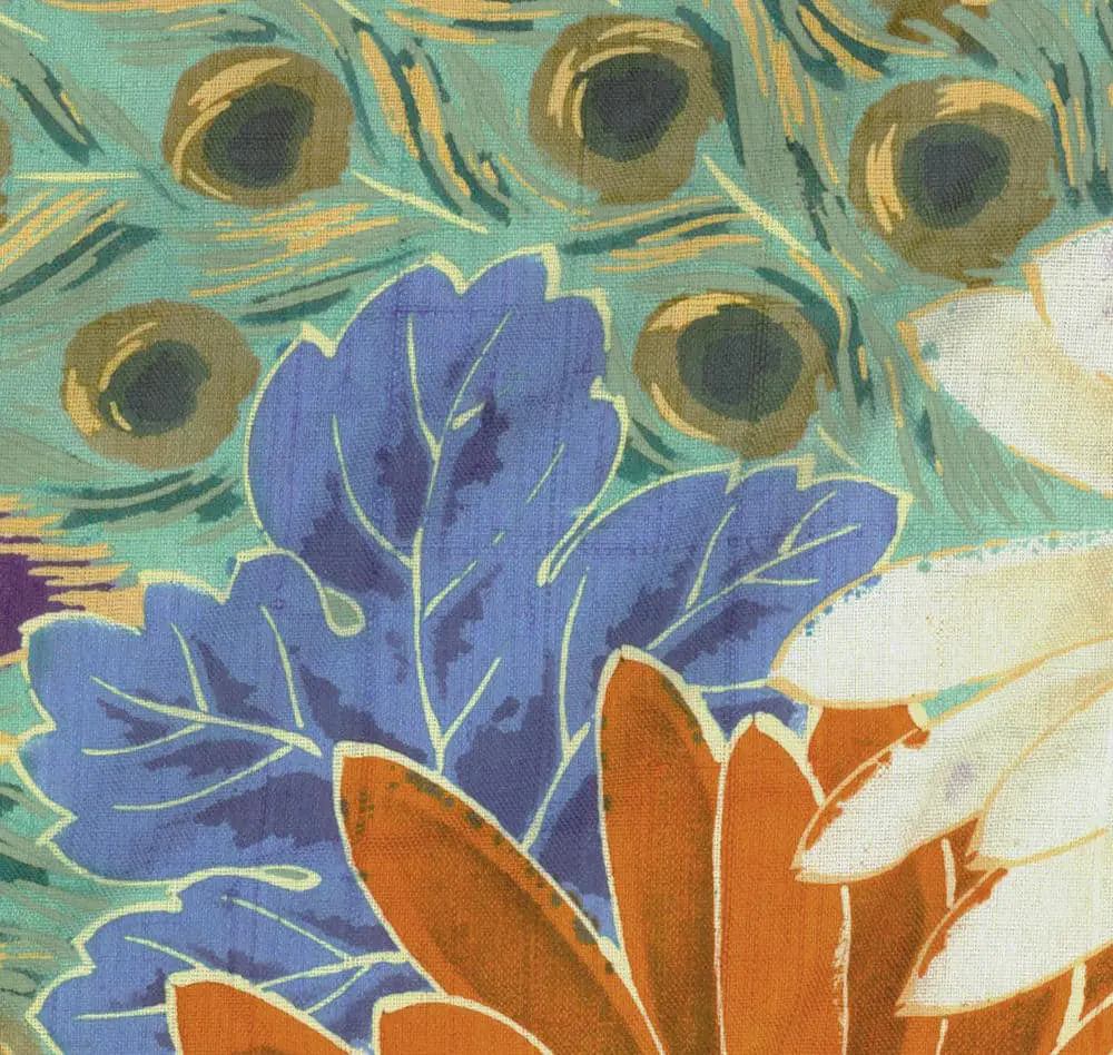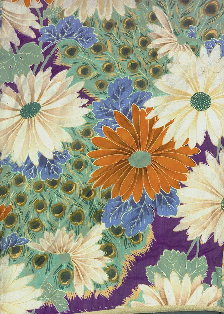 The detail images reveal the remarkable detail achievable through silkscreen printing, showing the intricate structure of both the peacock feathers with their characteristic ocelli (eye spots) and the layered petals of the chrysanthemums. The technique allows for subtle gradations within each motif while maintaining sharp, clean edges that give the overall design a distinctly modern graphic quality. This aesthetic approach suggests connections to the emerging Art Deco movement, with its emphasis on bold patterns and stylized natural forms, while the choice of motifs remains deeply rooted in Japanese symbolic tradition where chrysanthemums represent longevity and peacock feathers signify beauty and protection.
