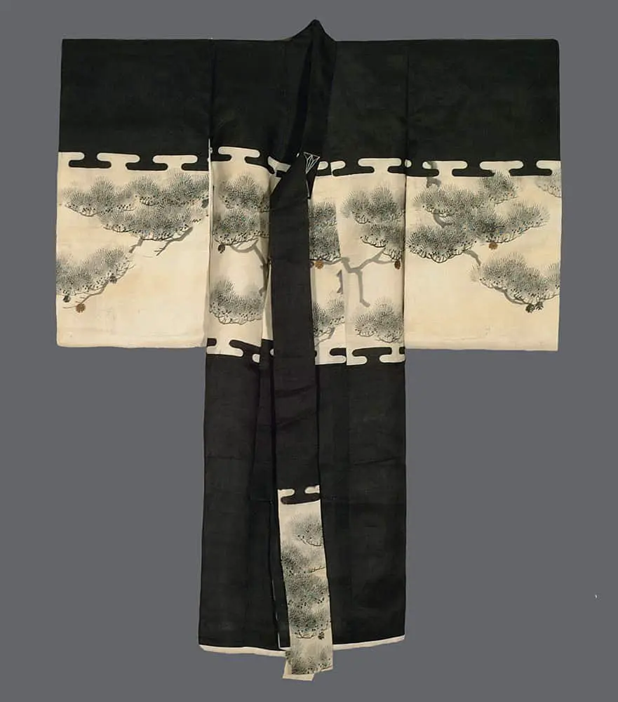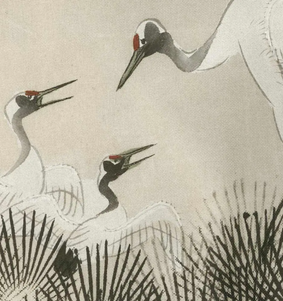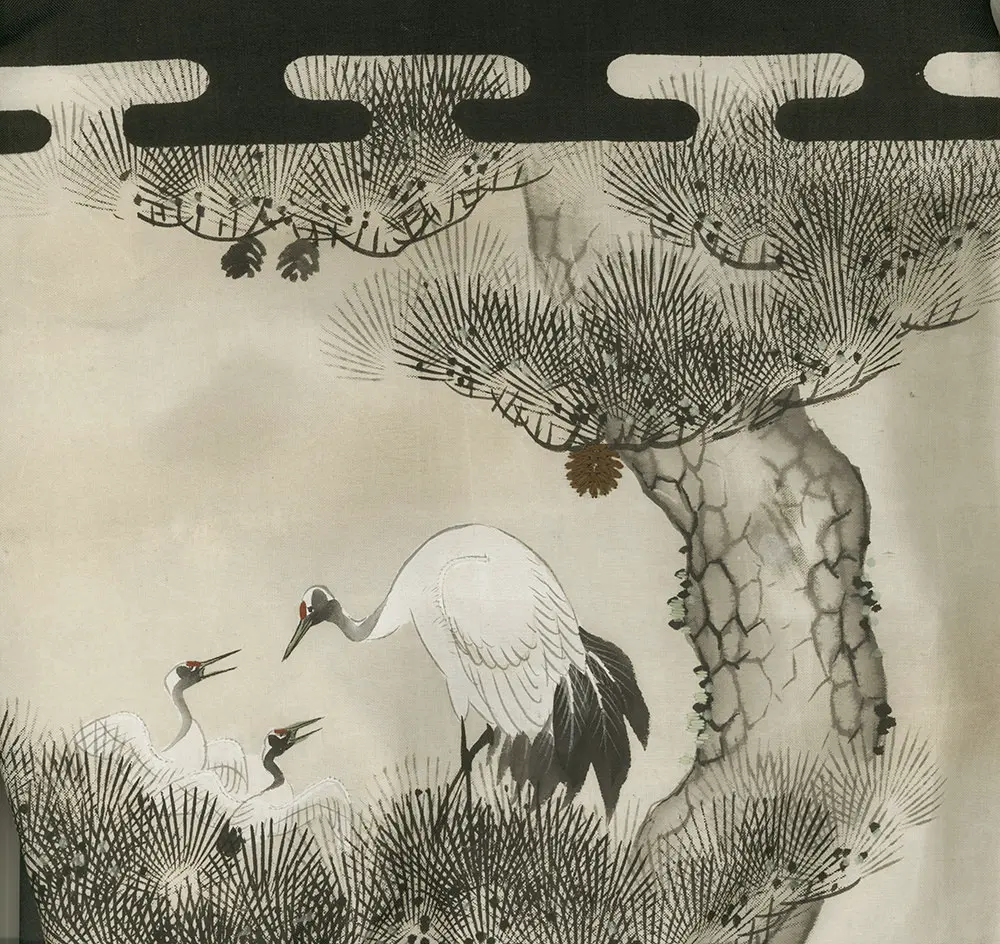 This silk miyamairi kimono, utilized for a baby girl's christening in a Shinto ceremony, showcases sumi e and painted depictions of auspicious cranes. Notably, the silk is relatively thick for this type of garment, and a blank white medallion replaces the family crest, indicating that this piece is from old warehouse stock that never had an owner. It remains in very good condition, with a few patinas, measuring 33 inches (84 cm) from sleeve-end to sleeve-end and standing at 42 inches (107 cm) in height.