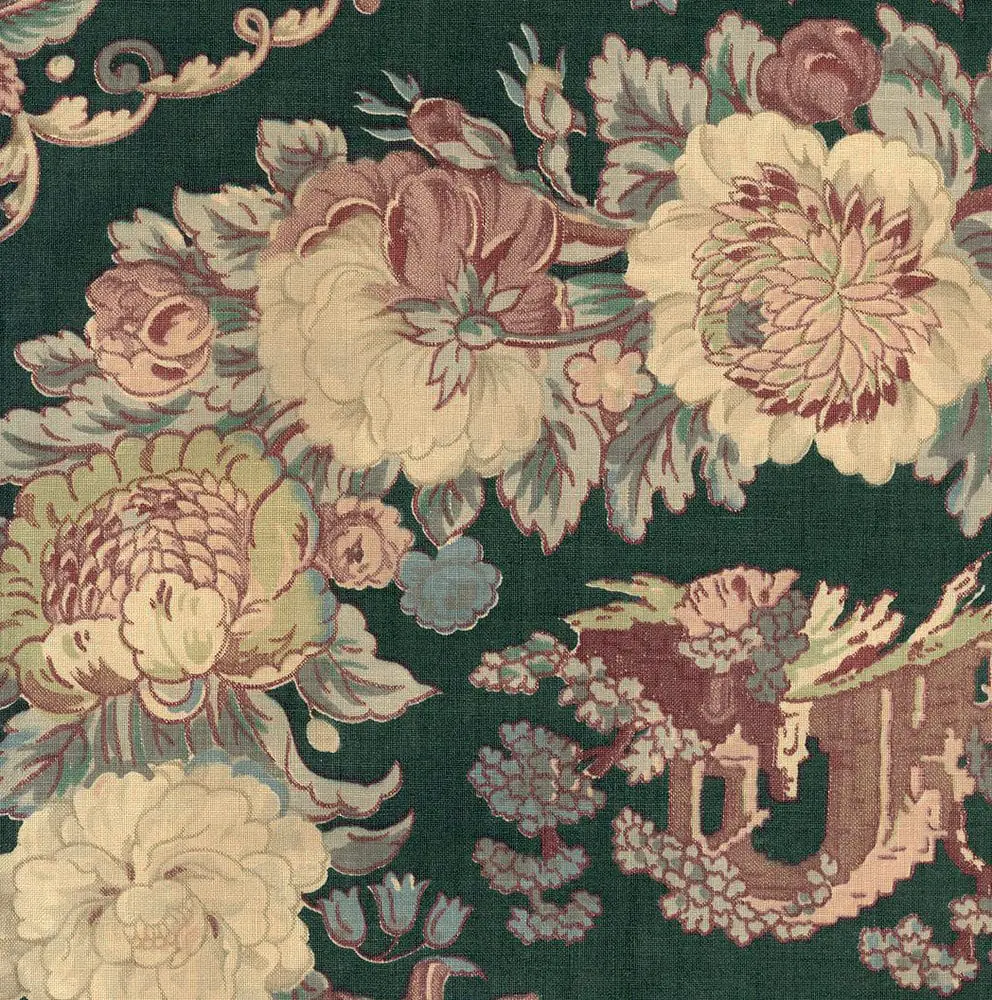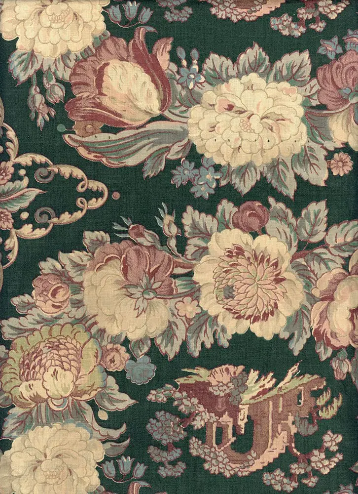 This 19th-century curtain panel, made from printed chintz with its glaze still intact, features a romantic pattern blending flower garlands with picturesque ruins. While the sateen lining has darkened over time, there's a small tear on one edge, causing a corresponding tear in the chintz hem. Despite these flaws, the curtain remains astonishingly intact and usable, as depicted in the images. The bottom edge of the panel measures 121 inches (307 cm) and its height is 57 inches (145 cm).