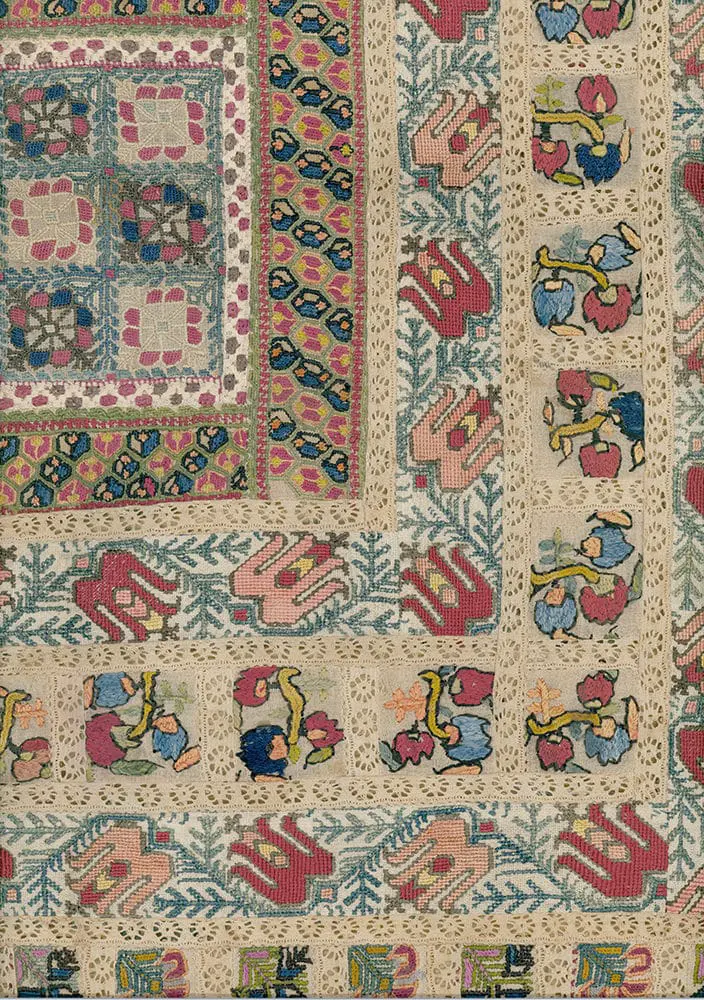 This embroidered panel, influenced by Ottoman style, showcases silk embroidery on a linen base—a characteristic of certain textiles from the Greek Islands. The panels were embroidered separately and linked by handworked decorative needlelace. It's backed by a cotton twill cloth and is in excellent condition, with only a few minor stains. Its dimensions are 31 inches by 31 inches (79 cm x 79 cm).