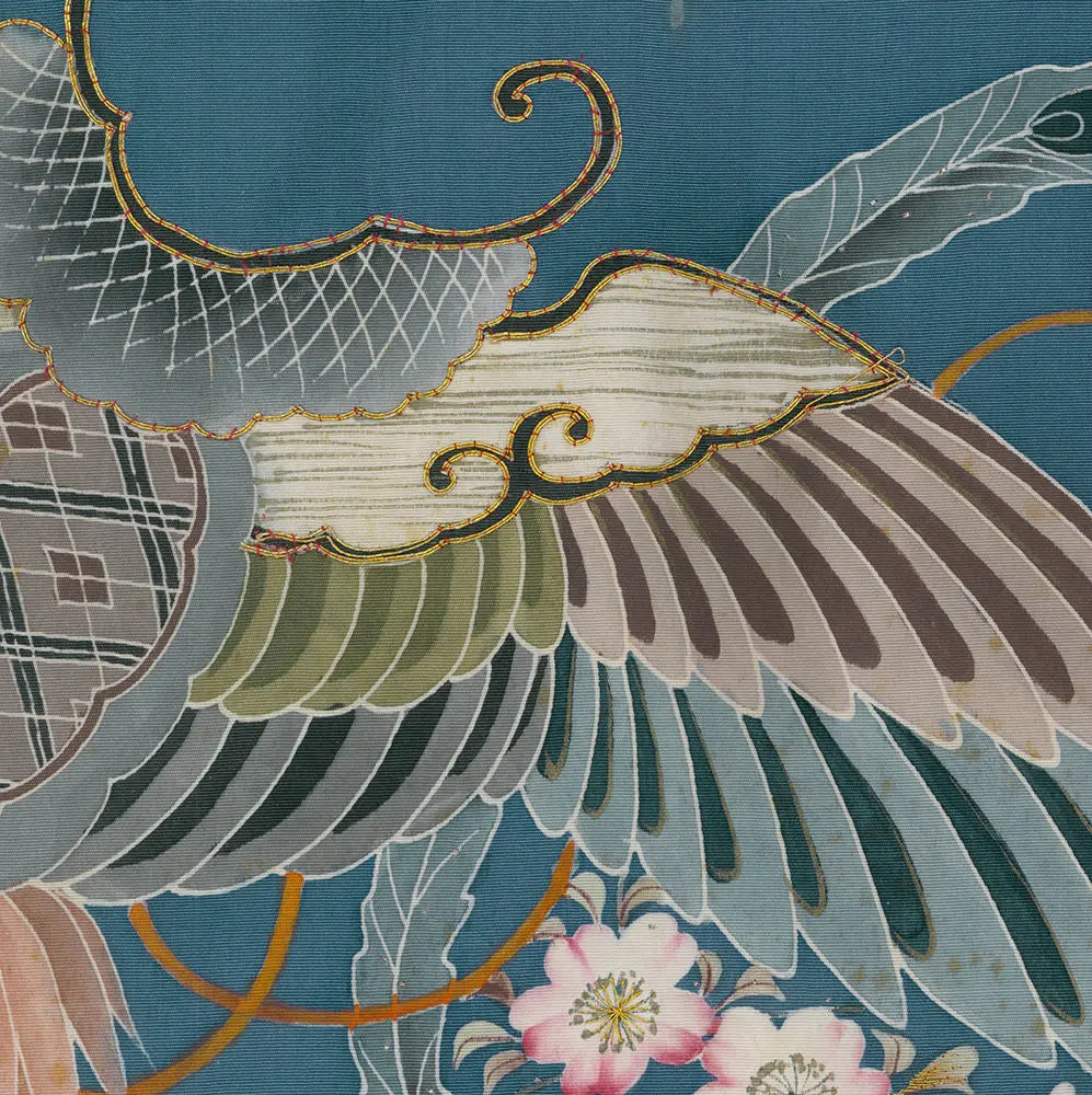 The imagery directly references the plot of Hagoromo, in which a celestial maiden descends to Earth and hangs her feathered robe on a pine tree. When a fisherman discovers the robe, she pleads for its return, explaining that without it she cannot ascend back to the heavens. The robe thus embodies themes of transcendence, impermanence, and harmony between the earthly and divine—concepts deeply embedded in Japanese aesthetics. For a furisode, a garment traditionally worn by young, unmarried women on auspicious occasions, this symbolism was especially resonant: it signified purity, grace, and the promise of an elevated, even transformative future, aligning with the ideals of coming-of-age or bridal celebrations.