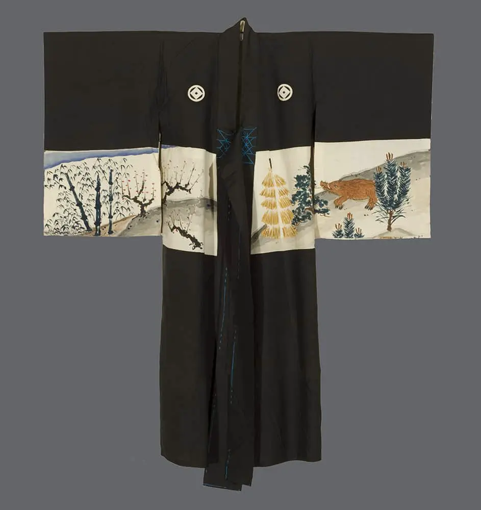This formal boy's miyamairi kimono features a masterfully hand-painted scene that is both artistically sophisticated and symbolically rich. The artwork, which flows continuously across the back seams in the elegant eba-moyō style, depicts wild boars charging through a snowy landscape with bamboo and plum trees. The painterly and naturalistic style, with its dynamic brushwork and emphasis on capturing movement, is reminiscent of the Maruyama-Shijō school of painting, which blended traditional Japanese techniques with Western realism.
