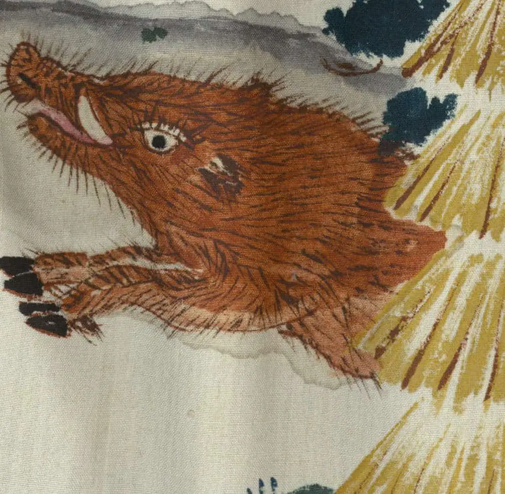 The choice of motifs conveys a powerful set of wishes for the infant boy's future. The wild boar (inoshishi), the last animal of the East Asian zodiac, is a potent symbol of courage, determination, and fearless forward momentum. It is complemented by the bamboo (take), which represents resilience, integrity, and strength, as it bends in the wind but does not break. Finally, the plum tree (ume), which blossoms in the cold of late winter, symbolizes perseverance, hope, and vitality in the face of adversity. Together, these elements form a collective prayer for the child to grow into a courageous, strong, and resilient man capable of overcoming any challenge.