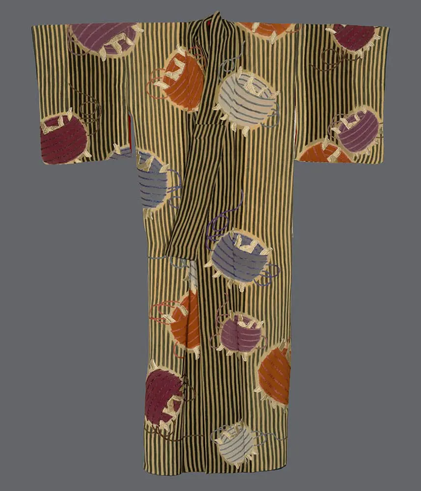 Traditionally, the silk-reel bobbin (itomaki) motif symbolizes the Tanabata festival, commemorating the yearly reunion of the Herdsman (Altair) and Weaver Girl (Vega) stars on the seventh day of the seventh month. According to legend, the Weaver Girl, daughter of the Celestial Emperor, fell in love with a Herdsman, neglecting her weaving duties. As punishment, they were separated by the Heavenly River (Milky Way) until the seventh day of the seventh month when they could reunite for a single night. The silk-reel bobbins on this kimono symbolize the Tanabata festival and were historically used by the Japanese for appeasing vengeful spirits.