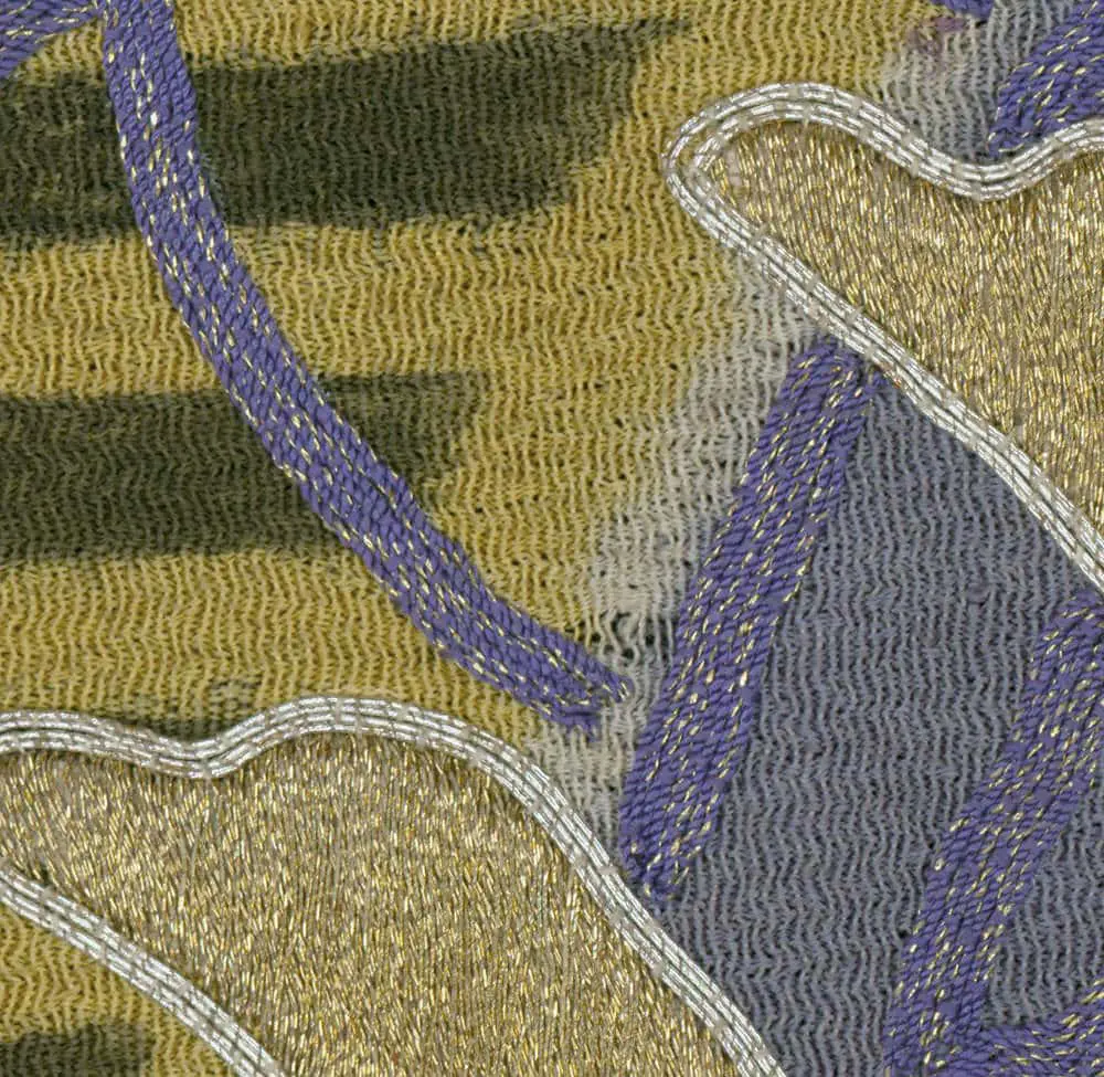 The artistic approach anticipates several key developments in early 20th-century design, particularly the Arts and Crafts movement's celebration of handwork and the later Art Nouveau fascination with objects from daily life transformed into decorative motifs. The meticulous multi-stage production process—involving initial crepe silk preparation, shibori resist-dyeing, selective yellow dyeing, hand-painted black striping, and finally dimensional embroidery—represents an almost obsessive commitment to technical perfection that elevates functional craft imagery into high art. The bobbins themselves, rendered with three-dimensional silk and metallic thread embroidery, appear to float against the striped ground like precious objects, suggesting both nostalgia for handcraft traditions and pride in textile artistry.