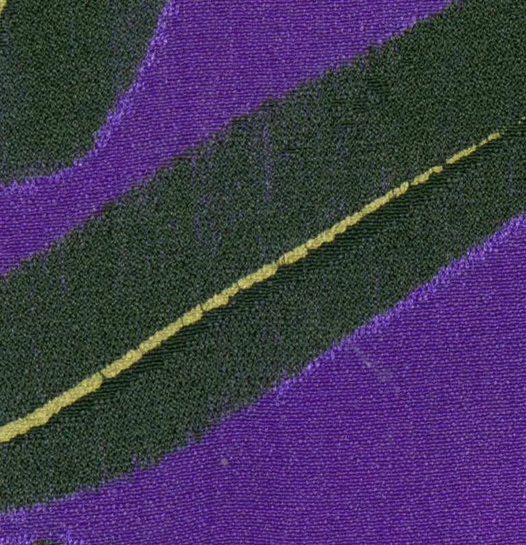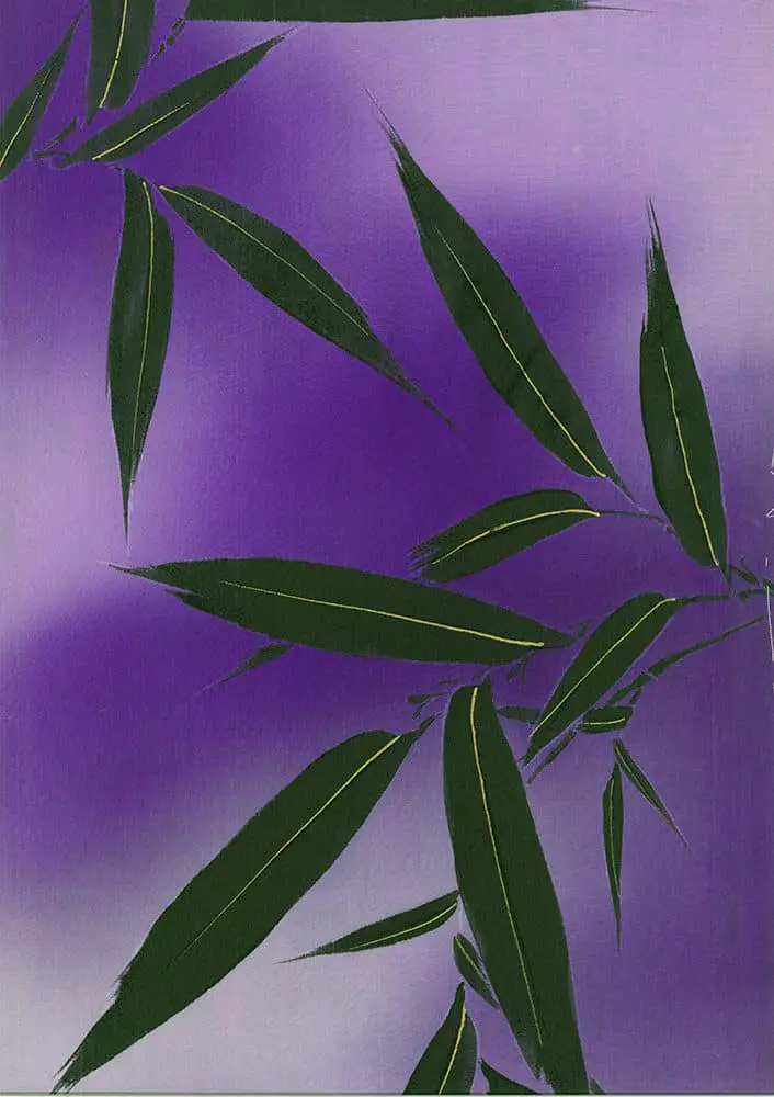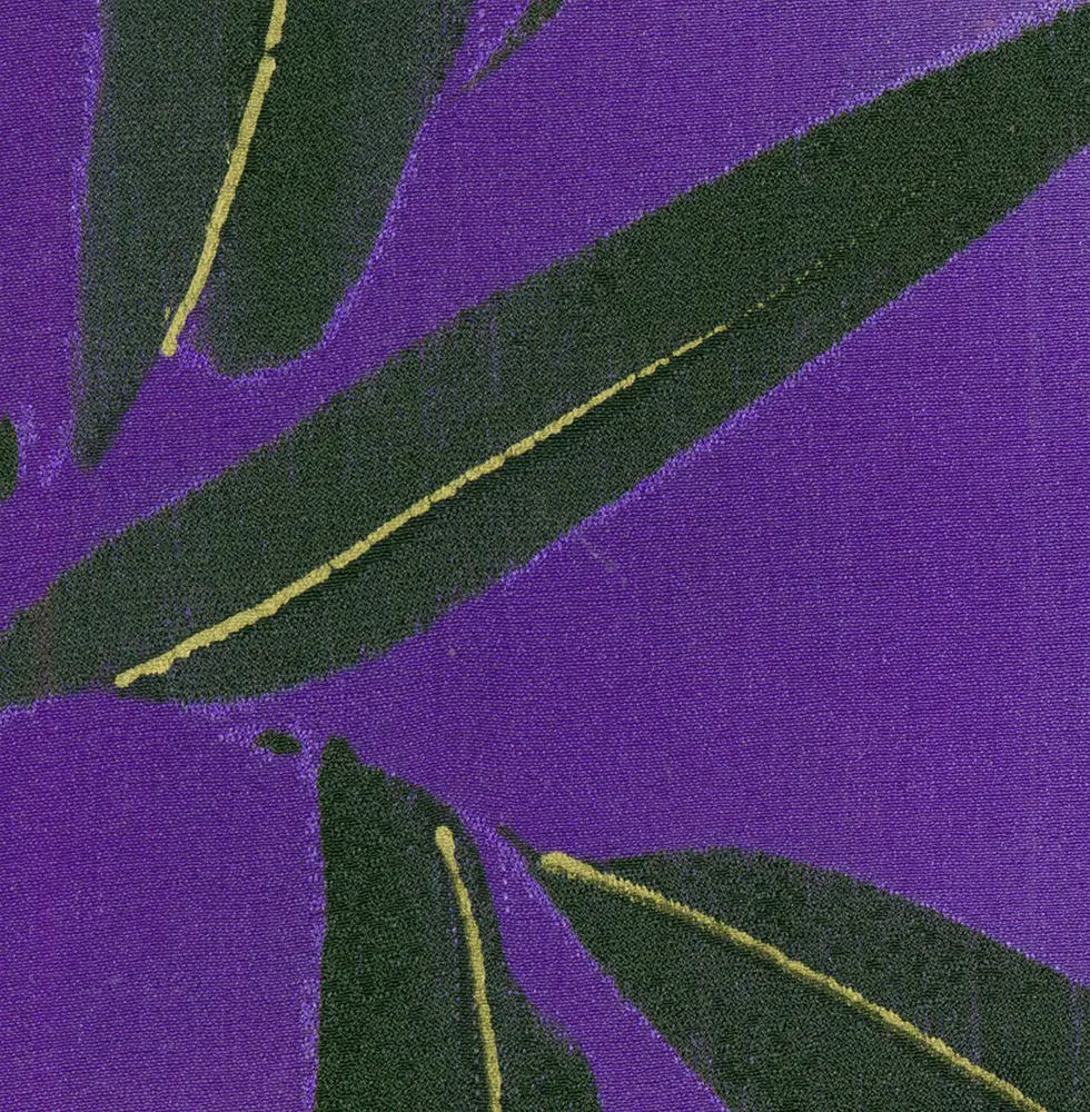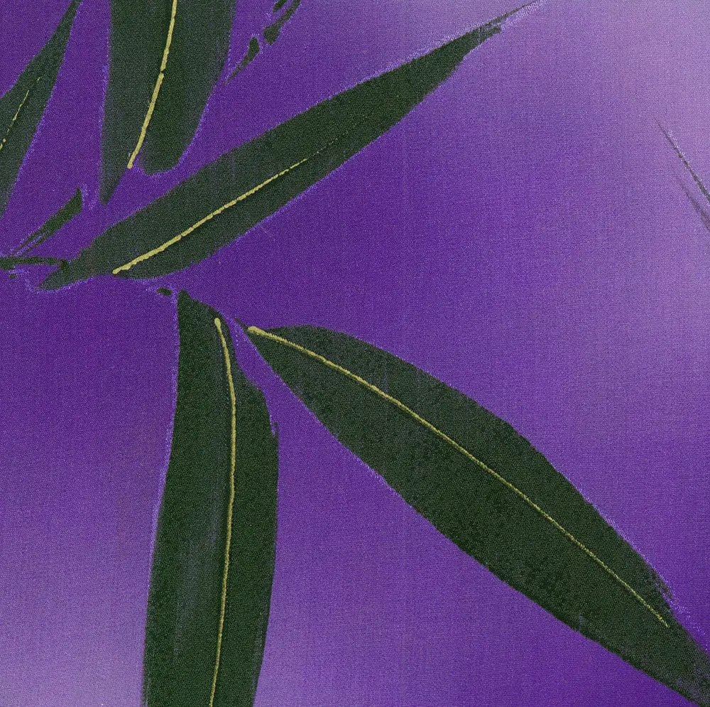 This rinzu silk haori features an intricate interplay between two levels of bamboo leaf motifs: the underlying damask weave creates a subtle self-figured pattern in the silk itself, while bold black bamboo leaves are applied over this foundation, creating an unusually complex visual dialogue between surface and substrate. The dramatic purple gradient background—ranging from deep violet at the edges to pale lavender in the center—provides a striking chromatic foundation that was relatively unconventional for traditional Japanese textiles of this period.