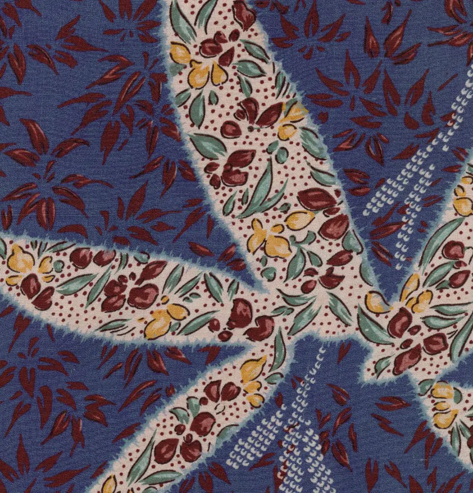 This silk jacket beautifully showcases silk-screened bamboo leaves and is in excellent condition. It measures 50 inches (127 cm) from sleeve-end to sleeve-end and stands 37 inches (94 cm) tall.