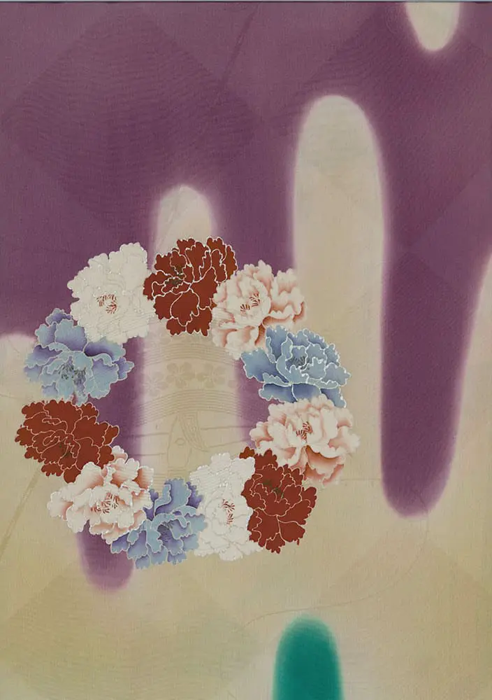 The yuzen-painted floral garlands appear to float weightlessly against this atmospheric background, their circular compositions creating rhythmic punctuation points across the garment's flowing surface. The detail images reveal the extraordinary refinement of the painting technique, where peonies in deep burgundy, soft rose, and powder blue demonstrate the artist's mastery of tonal variation and dimensional modeling. Each bloom is rendered with naturalistic precision, yet their arrangement in perfect circles suggests a more decorative, almost Art Nouveau sensibility that speaks to cross-cultural artistic exchange during Japan's period of international engagement.