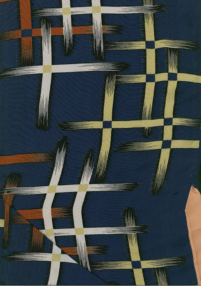 This silk kimono from Japan's Taishō period (1912-1926) is a vibrant example of the era's embrace of modernism and international design. The garment features a bold, silk-screened pattern of an abstract, irregular grid set against a deep teal background. The intersecting lines, rendered in contrasting shades of off-white, gold, and terracotta, possess a dynamic, textured quality that mimics the appearance of expressive brushstrokes. This design moves away from traditional, pictorial motifs and instead celebrates geometric abstraction, rhythm, and graphic impact. The aesthetic strongly evokes Western art movements of the time, particularly the geometric stylization of Art Deco and the textured, handcrafted feel celebrated by the Arts and Crafts movement. This fusion of international modernism with Japanese design sensibilities was a hallmark of the Taishō Roman cultural phenomenon, reflecting a cosmopolitan spirit and a desire for new forms of expression in fashion and art.
