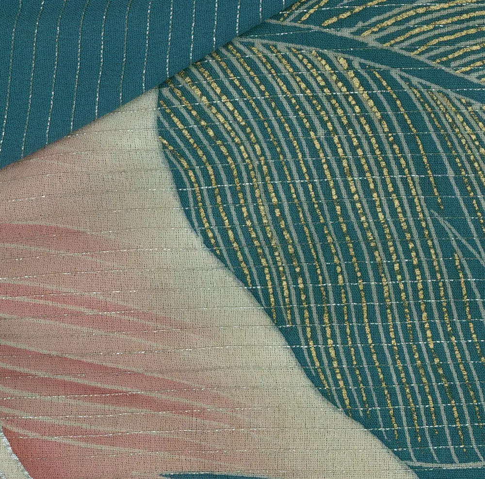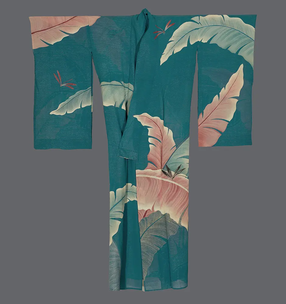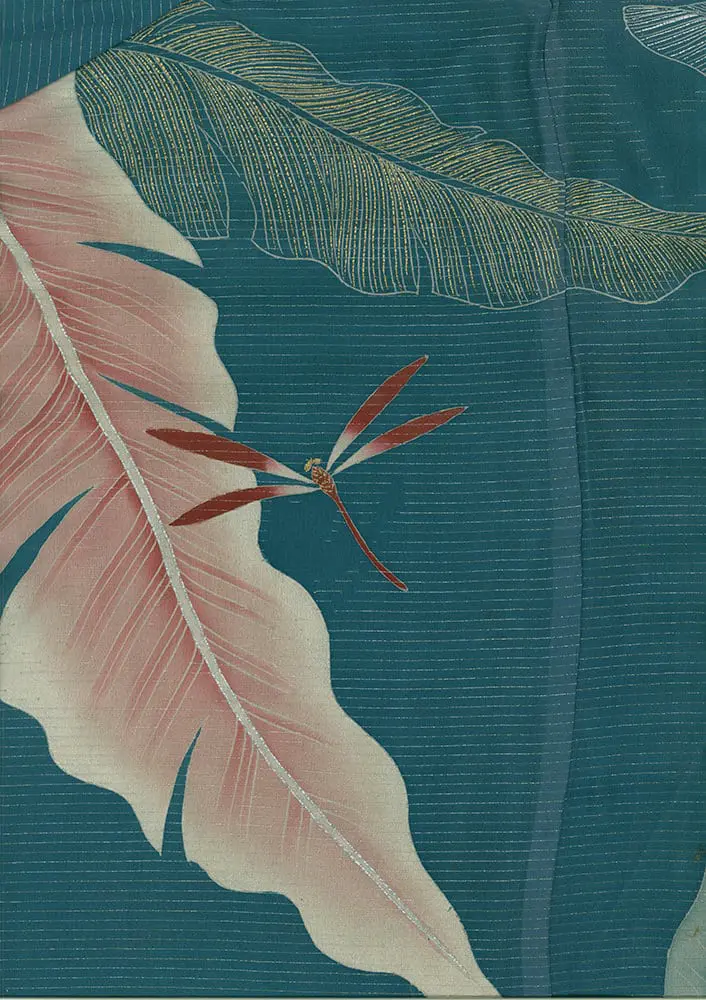This striking summer kimono exemplifies the sophisticated aesthetic of early 20th century Japanese textile design, presenting an bold interpretation of tropical botanical motifs against a vibrant turquoise ground. The composition features dramatically oversized banana leaves (basho) rendered in soft coral pink and sage green tones, their naturalistic forms creating sweeping diagonal movements across the garment that demonstrate the influence of Western Art Nouveau's organic flowing lines merged with traditional Japanese decorative sensibilities. The leaves are painted with remarkable attention to their natural structure, showing the characteristic splits and tears that occur in banana foliage, while delicate dragonflies (tonbo) punctuate the design as small jewel-like accents, their forms enhanced with metallic foil that would catch and reflect light as the wearer moved.