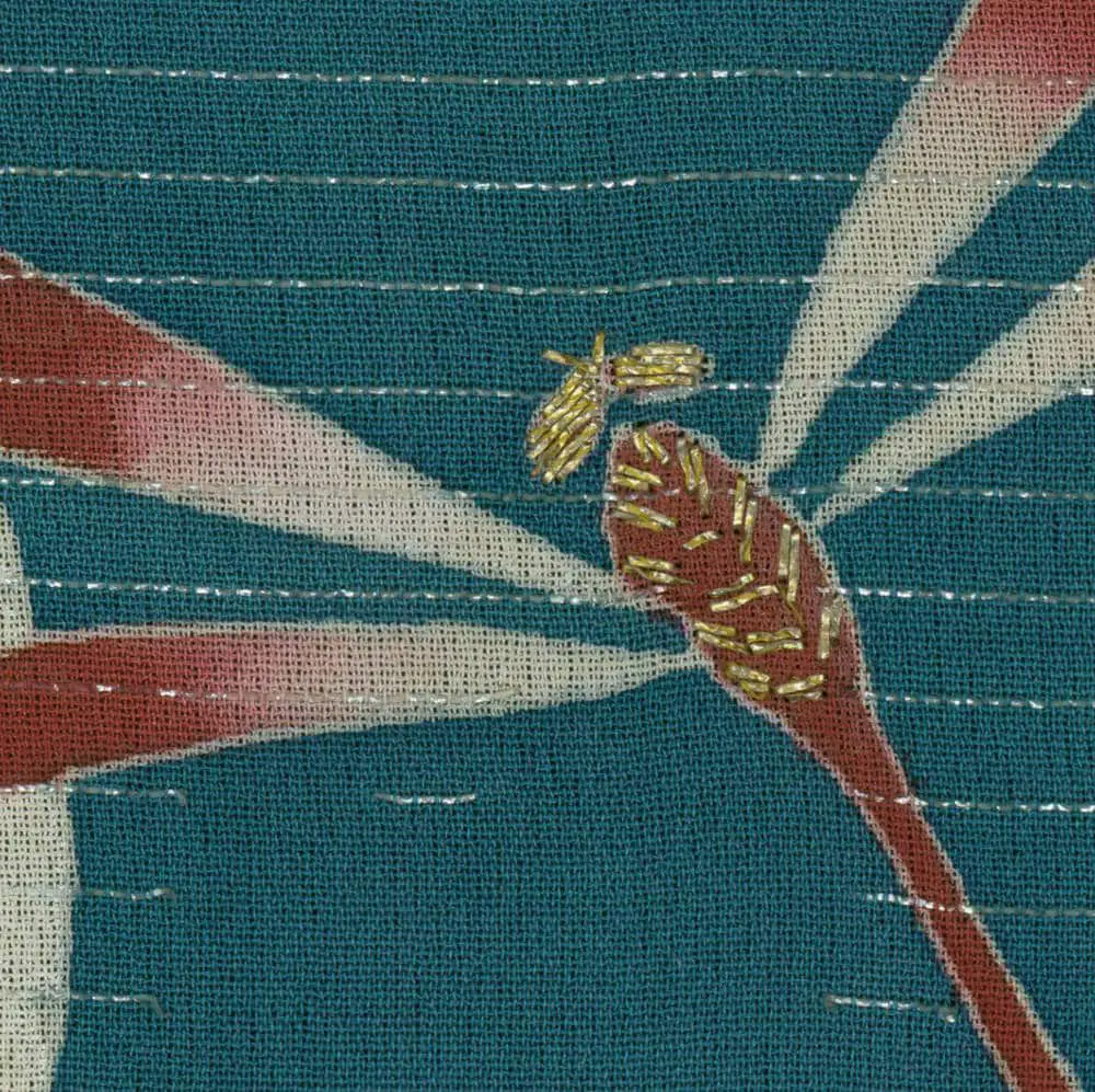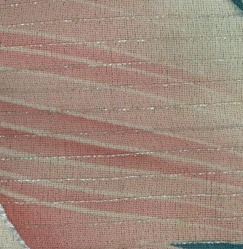 The artistic approach reflects the Taishō period's embrace of bold color combinations and simplified, modernist forms that departed from the more complex pictorial narratives of earlier kimono design. The use of hitoe construction - a single-layer silk appropriate for summer wear - allowed for the translucent quality that makes the colors appear to glow with inner light, while the integration of horizontal silver threads creates subtle textural contrasts that speak to the period's experimentation with mixed media approaches. The banana leaf motif, while not traditionally Japanese, represents the era's fascination with exotic imagery and suggests prosperity and abundance, while the dragonflies carry traditional associations with courage, strength, and happiness. This synthesis of Western tropical aesthetics with Japanese craftsmanship techniques creates a garment that embodies the cosmopolitan spirit of Japan's rapid modernization period, when traditional arts absorbed international influences while maintaining their distinctive cultural identity.