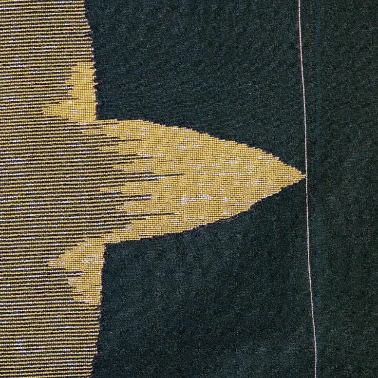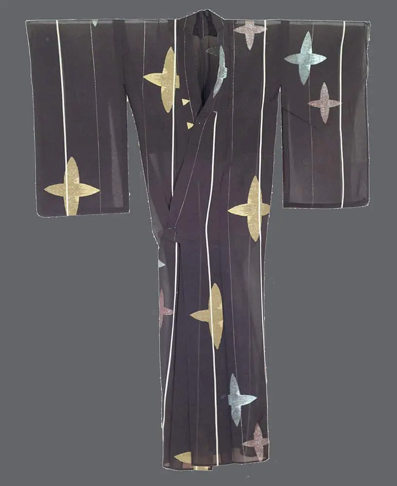 This unlined silk kimono boasts large star patterns crafted using urushi (lacquered) threads. It stands at 50 inches from sleeve-end to sleeve-end and reaches a height of 62 inches (127 cm x 157 cm). While it's in very good condition, there are some minor holes and stains present.