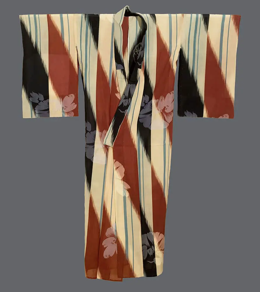 This summer kimono demonstrates the remarkable technical mastery of kasuri ikat weaving combined with supplementary thread work, creating a sophisticated interplay between geometric abstraction and naturalistic floral motifs. The garment features bold diagonal stripes in rust red, deep black, and cream that showcase the characteristic feathered edges of kasuri technique, where threads are resist-dyed before weaving to create these softly blurred boundaries. Against this dynamic striped ground, delicate morning glory blossoms appear in muted tones of gray and pink, rendered through supplementary thread technique that allows the floral motifs to seemingly float above the underlying geometric pattern.