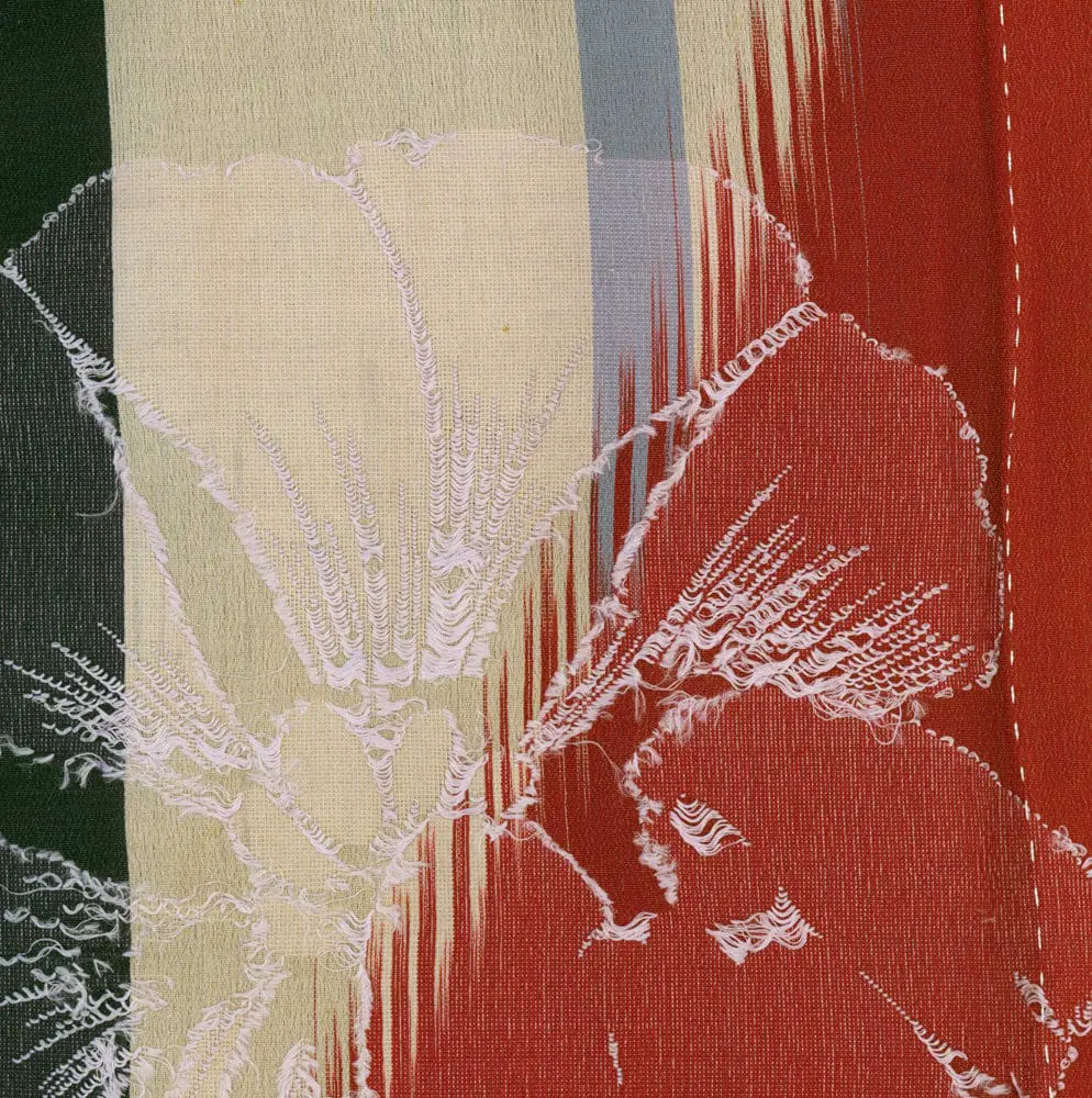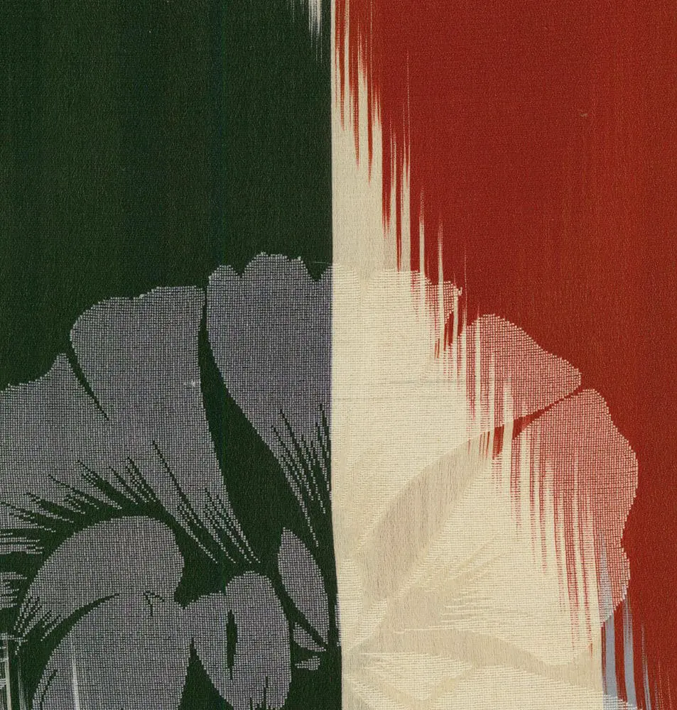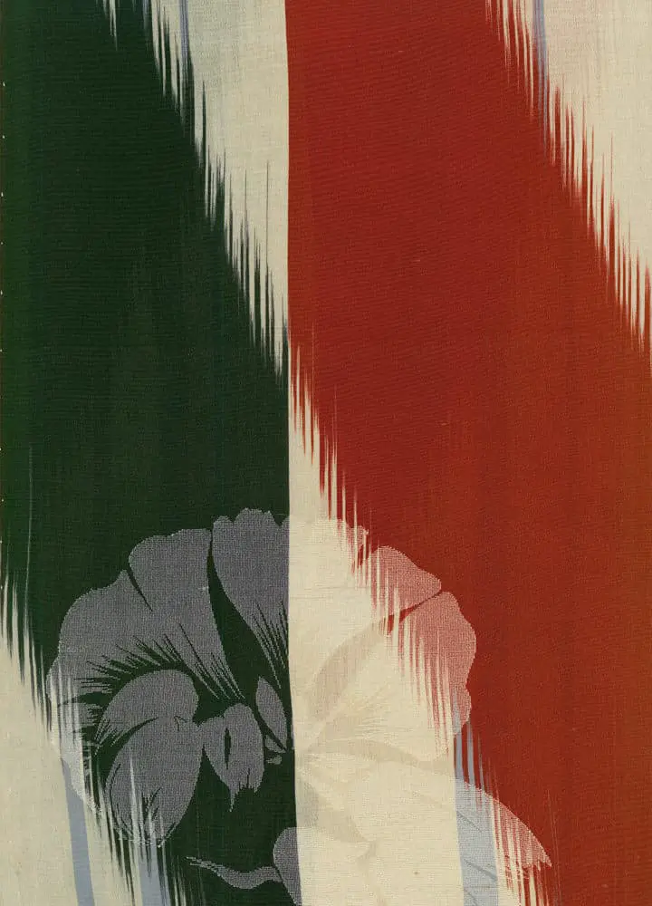 The technical achievement evident in this textile reflects the sophisticated developments in Japanese weaving during the early 20th century, when traditional craft techniques were being refined and reimagined. The precise coordination required between the kasuri dyeing process and the supplementary thread work demonstrates extraordinary planning and skill, as the weaver had to anticipate how the pre-dyed warp and weft threads would align to create the diagonal stripes while simultaneously incorporating the additional threads needed for the floral motifs. This combination of techniques creates a textile that embodies both the mathematical precision of geometric design and the organic beauty of nature, reflecting the Japanese aesthetic principle of finding harmony between opposing forces.