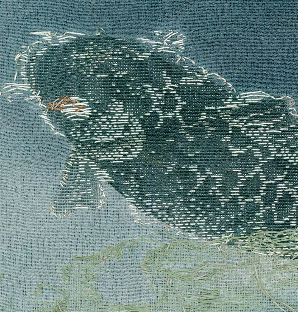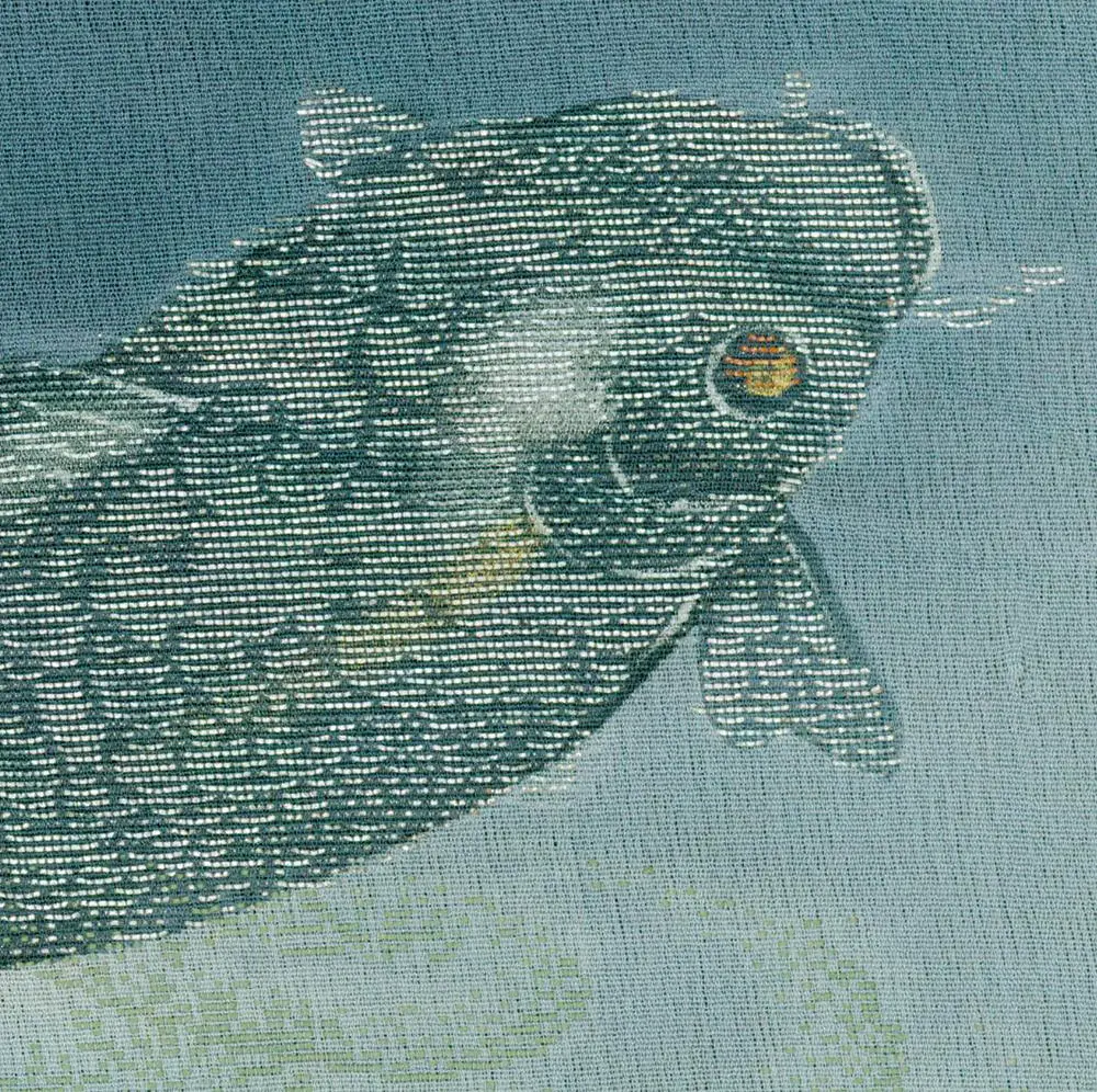 The close-up details reveal the sophisticated weaving technique that creates each carp's distinctive scaled texture through thousands of tiny metallic threads, demonstrating the nishijin-ori tradition's pinnacle of technical mastery. The artistic composition reflects Japanese aesthetic principles of ma (negative space) and wabi-sabi (finding beauty in imperfection), where the seemingly random placement of the carp creates natural rhythm and balance. This garment exemplifies the post-war period's continuation of traditional Japanese textile arts while embracing more naturalistic and flowing design sensibilities, moving away from the rigid geometric patterns of earlier eras toward a more organic, almost painterly approach that celebrates both technical virtuosity and poetic interpretation of the natural world.