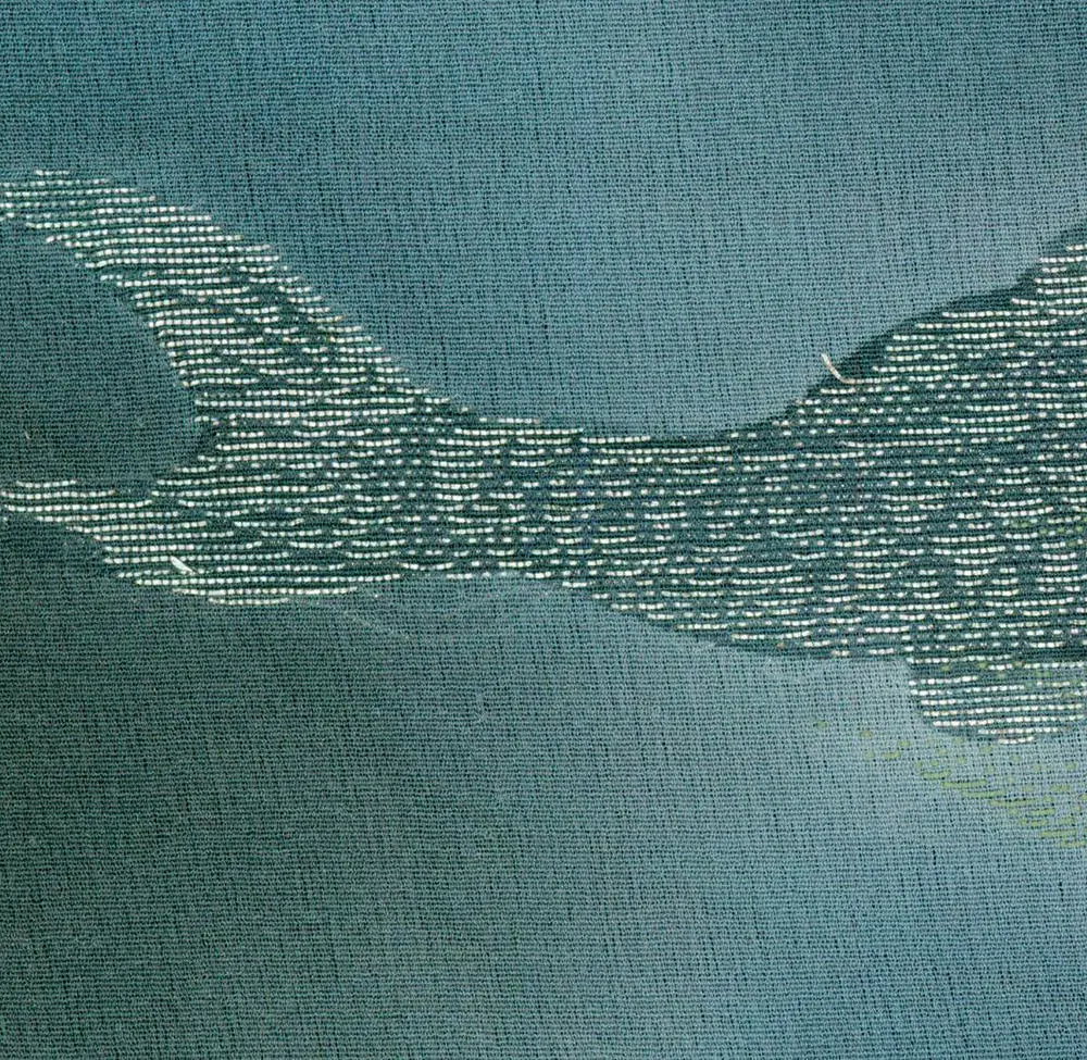This extraordinary silk hitoe kimono represents a stunning achievement in mid-20th century Japanese textile artistry, where the entire garment transforms into a living aquatic tableau. The kimono's most remarkable feature is its masterful use of woven gradations that create the illusion of water in motion, shifting from deep indigo through ethereal sky blues to luminous whites, evoking the play of light beneath a water's surface. Swimming through this liquid landscape are wild carp (nishikigoi), rendered with exceptional technical skill using silver metallic thread inserts that catch and reflect light like actual fish scales moving through water. The carp, revered in Japanese culture as symbols of perseverance, strength, and good fortune, appear to glide effortlessly across the fabric's surface, their forms emerging and disappearing into the fluid background in a manner that suggests the Impressionist movement's fascination with capturing light and movement.