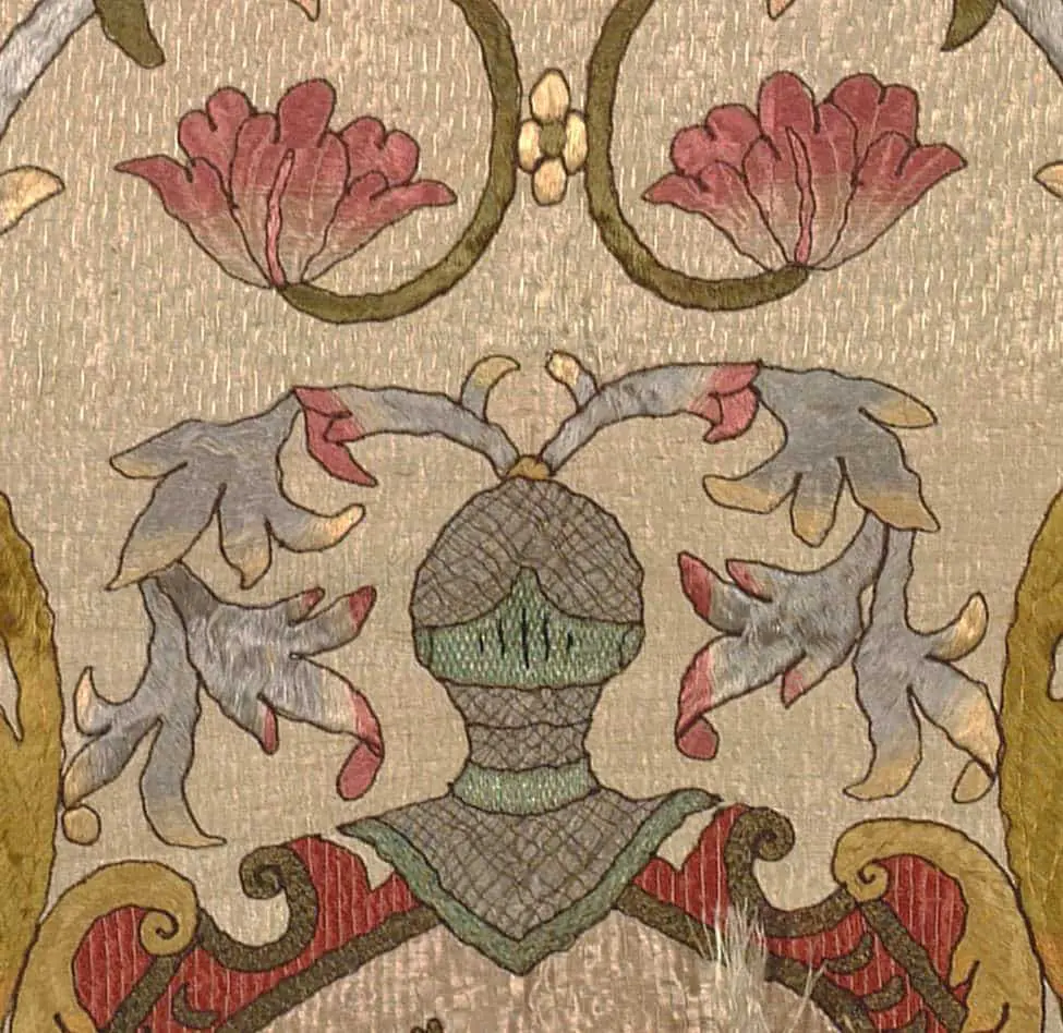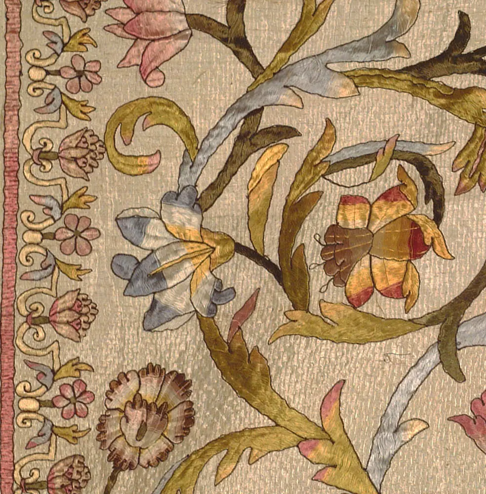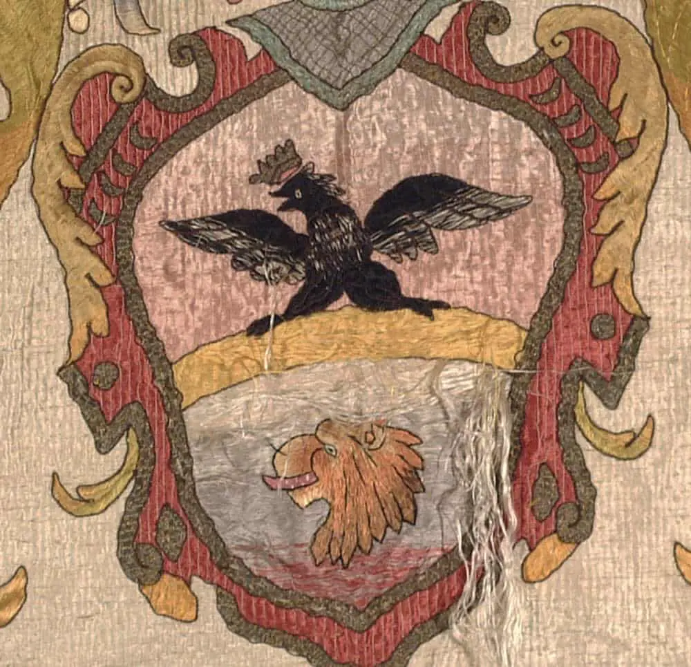 This large Italian floss-silk embroidered coverlet, complete with silk lining and a 6-inch lace embroidery border, is in very good condition. There are some loose silk floss strands around the heraldic area in the center, a minor issue that could be corrected by a restorer in a few hours. The lace border might have been created contemporaneously with the main embroidery or added in later generations. Excluding the lace border, its dimensions are 72 inches by 97 inches (183 cm x 246 cm).