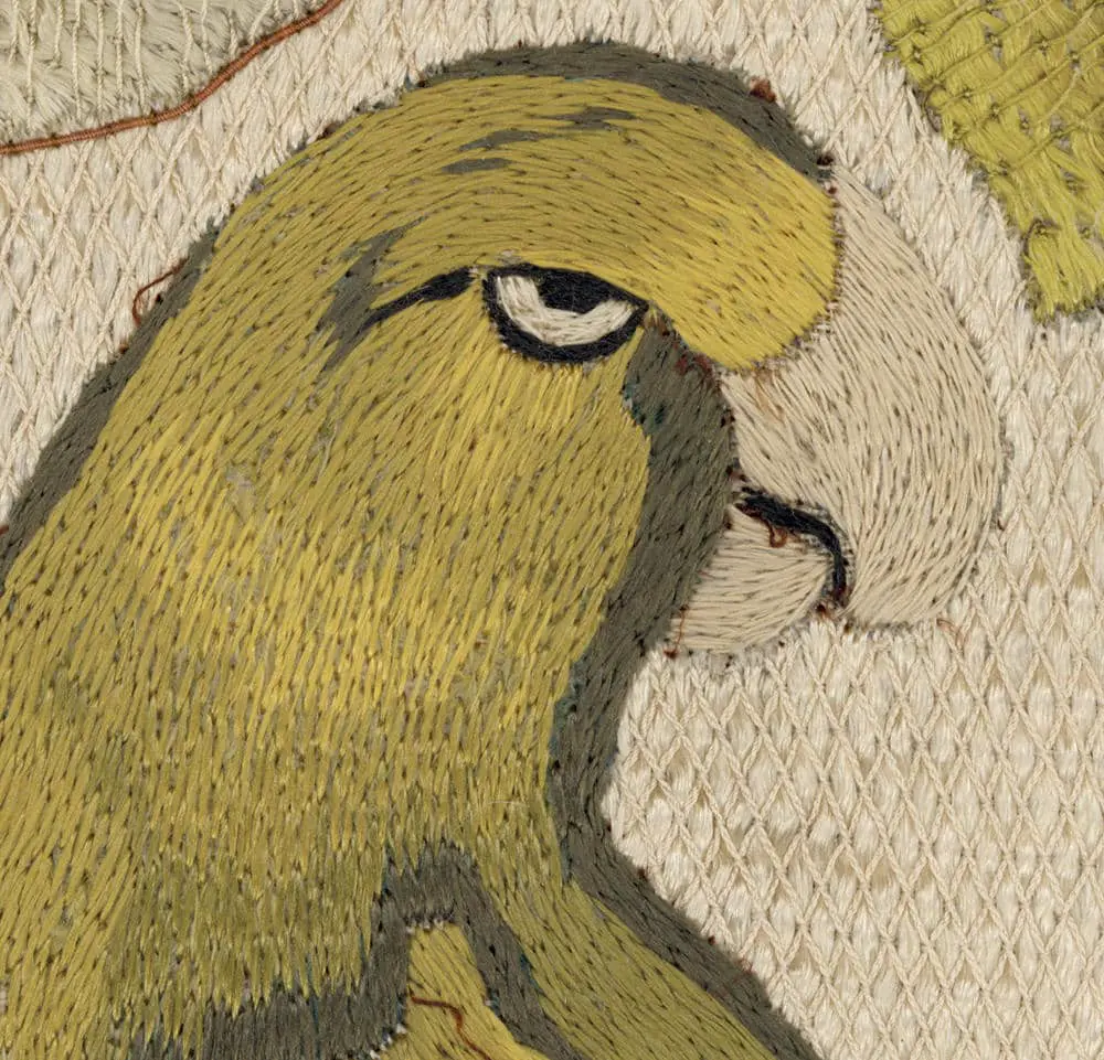 This extensive and unique embroidery employs various stitching techniques and a diverse array of colored silk threads. Notably, copper-colored metallic threads are used throughout the main section, while the two-inch border and center design exclusively feature gold or gold-colored metallic thread.