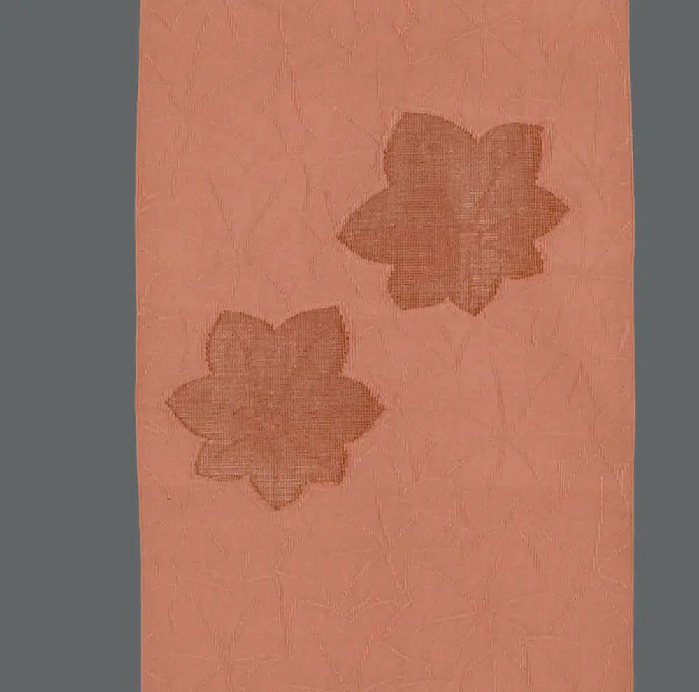 This silk textile, in a rich paprika hue, features raised threads forming a lotus flower motif. The main photo displays only a portion of the fabric. Half of the underside is lined with silver silk, maintaining an excellent condition. It measures 13 inches (33 cm) in width along the main center, tapering to 6.5 inches (17 cm) towards the ends, and spans 142 inches (361 cm) in length.