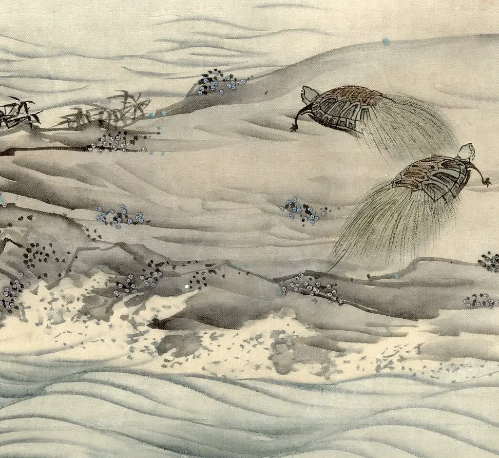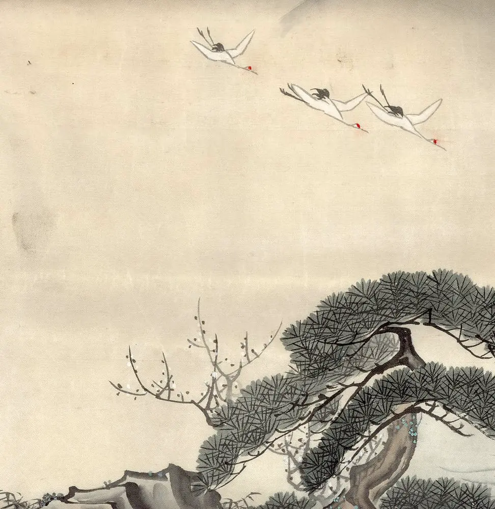 This fukusa depicts a scene of a flowing stream, pine trees, an old tortoise, and a flying crane, symbolizing wishes for longevity and good fortune. It's adorned with small flowers crafted using sagara embroidery, a form of knot embroidery. While in good condition with an age patina, there's some noticeable soiling visible on both the front and back, as shown in the images.
