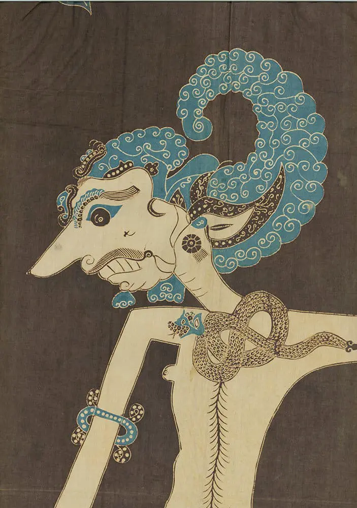 This fine cotton batik depicts a wajang puppet character and is in very good condition. It measures 30 inches (76 cm) in width and 52 inches (132 cm) in height.